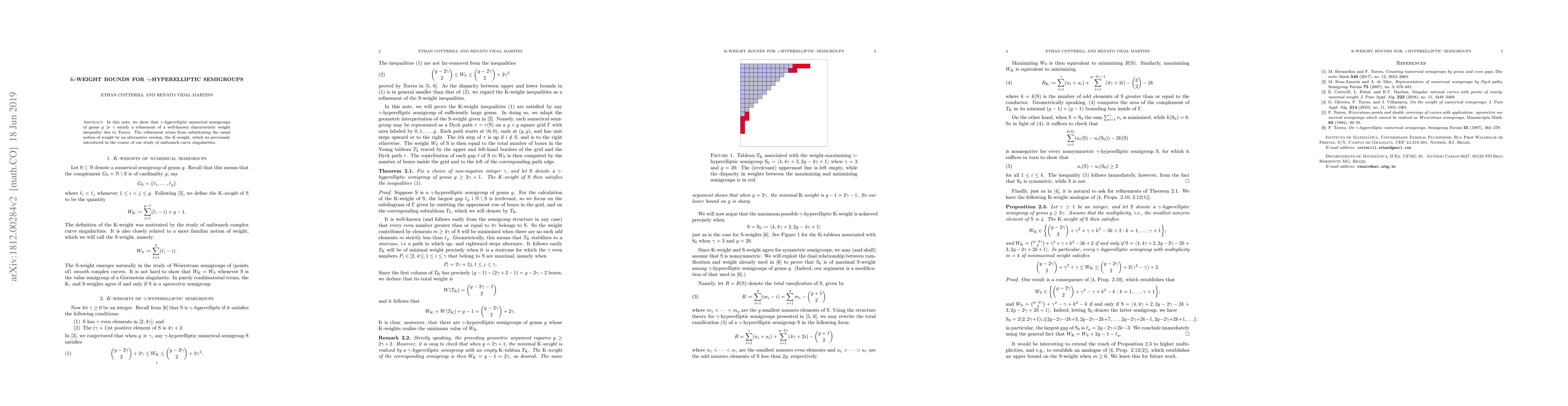 In this note, we show that {\it $\gamma$-hyperelliptic} numerical semigroups of genus $g \gg \gamma$ satisfy a refinement of a well-known characteristic weight inequality due to Torres. The refinement arises from substituting the usual notion of weight by an alternative version, the $K$-weight, which we previously introduced in the course of our study of unibranch curve singularities.