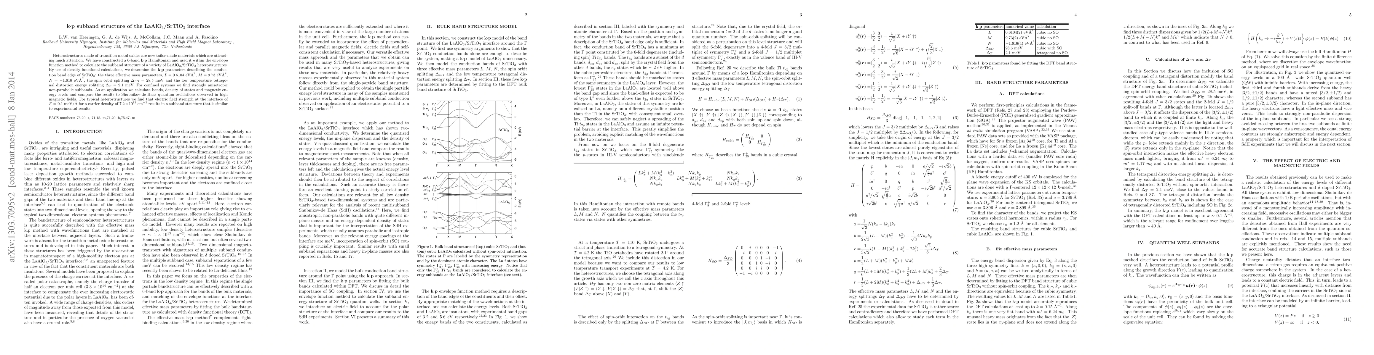 Heterostructures made of transition metal oxides are new tailor-made materials which are attracting much attention. We have constructed a 6-band k.p Hamiltonian and used it within the envelope function method to calculate the subband structure of a variety of LaAlO3/SrTiO3 heterostructures. By use of density functional calculations, we determine the k.p parameters describing the conduction band edge of SrTiO3: the three effective mass parameters, L=0.6104 eV AA^2, M=9.73 eV AA^2, N=-1.616 eV AA^2, the spin orbit splitting Delta_SO=28.5 meV and the low temperature tetragonal distortion energy splitting Delta_T=2.1 meV. For confined systems we find strongly anisotropic non-parabolic subbands. As an application we calculate bands, density of states and magnetic energy levels and compare the results to Shubnikov-de Haas quantum oscillations observed in high magnetic fields. For typical heterostructures we find that electric field strength at the interface of F = 0.1 meV/AA for a carrier density of 7.2 10^{12} cm^-2 results in a subband structure that is similar to experimental results.