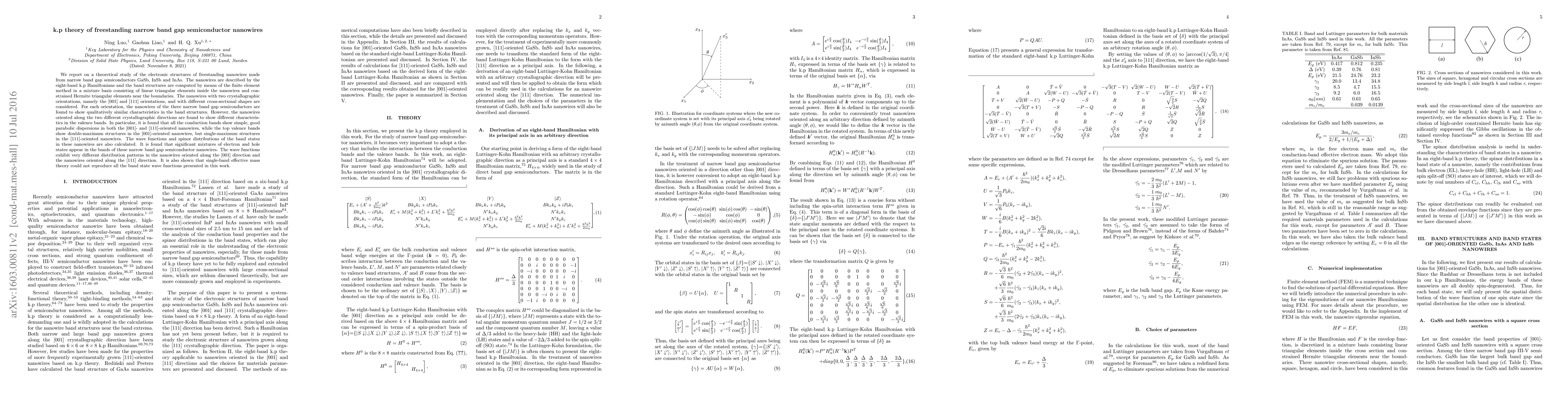 This paper presents a theoretical study on the electronic structures of freestanding narrow band gap semiconductor nanowires (GaSb, InSb, and InAs) using k.p theory. It finds that while conduction bands exhibit simple parabolic dispersions, valence bands differ significantly between [001] and [111] orientations, with double-maximum in [001] and single-maximum in [111] orientations, and highlights the inadequacy of single-band effective mass theory in capturing these complex behaviors.
