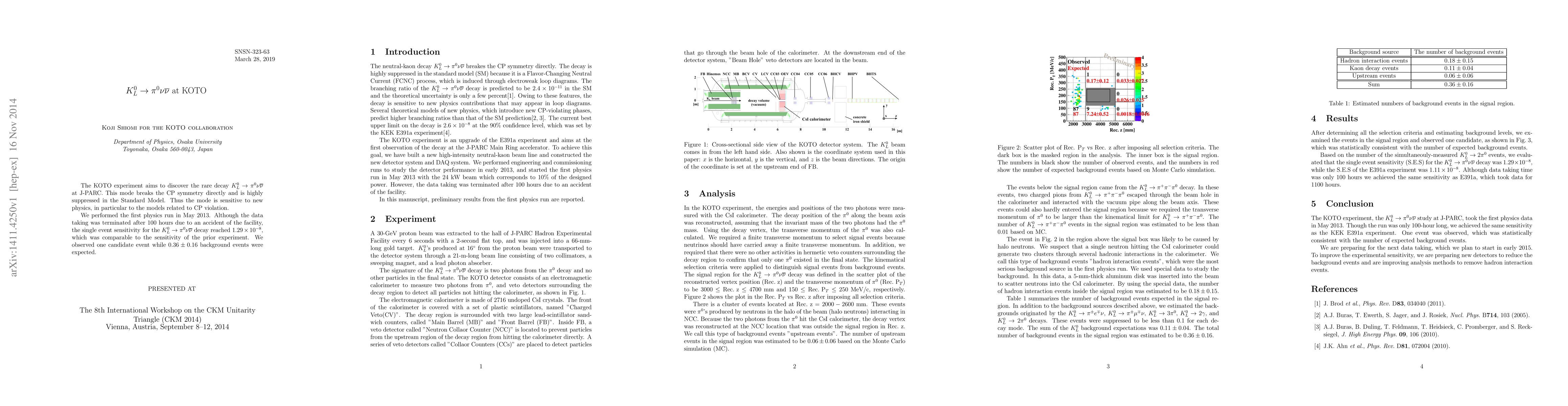 The KOTO experiment seeks to detect the rare decay $K^{0}_{L}\rightarrow \pi^{0} \nu \bar{\nu}$, which is sensitive to new physics due to its suppression in the Standard Model and potential implications for CP violation. Despite a short data collection period, the experiment achieved a comparable single event sensitivity to prior studies and observed one candidate event.