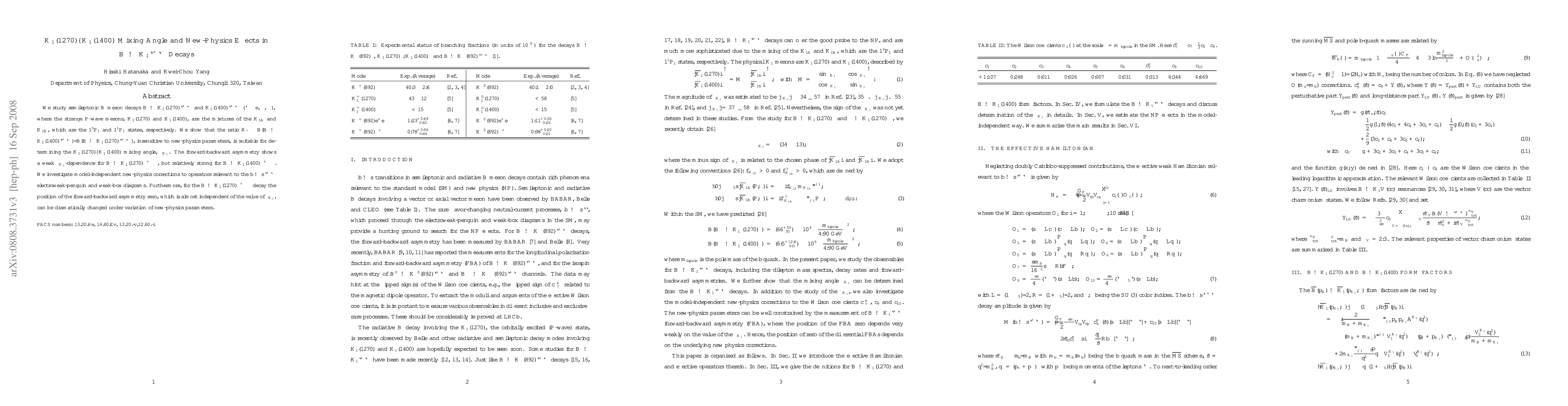 This paper investigates semileptonic B meson decays into K_1(1270) and K_1(1400) mesons, focusing on the K_1(1270)-K_1(1400) mixing angle, theta_{K_1}, and its dependence on new-physics effects. The ratio R_l is proposed as a reliable indicator for theta_{K_1}, while the forward-backward asymmetry shows significant sensitivity to new-physics parameters, especially in decays involving muons.