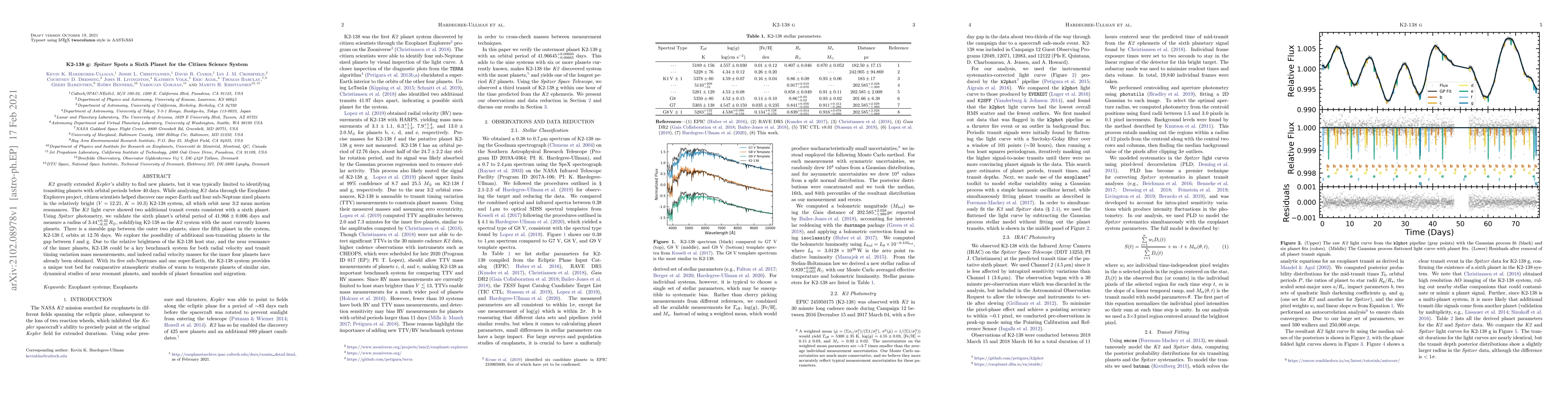 The K2-138 system, discovered via citizen science analysis of K2 data, now includes a sixth planet, confirmed by Spitzer photometry, with a radius of 3.44 Earth radii and an orbital period of 41.97 days. This system, featuring five sub-Neptunes and one super-Earth, offers a valuable benchmark for studying planet formation, dynamics, and comparative atmospheric science.