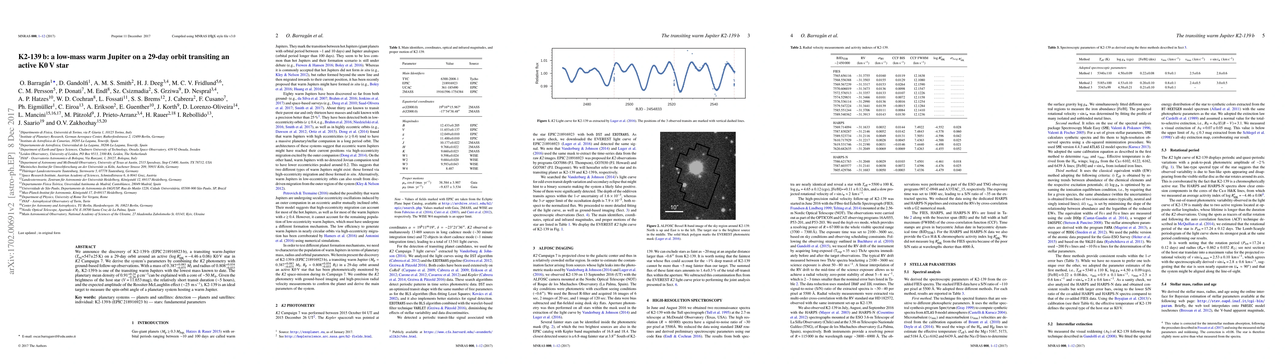 K2-139 b is a low-mass warm Jupiter transiting an active K0 V star with a 29-day orbit. It has a mass of 0.387 $M_{\rm J}$ and a radius of 0.808 $R_{\rm J}$, making it one of the lowest mass transiting warm Jupiters discovered.