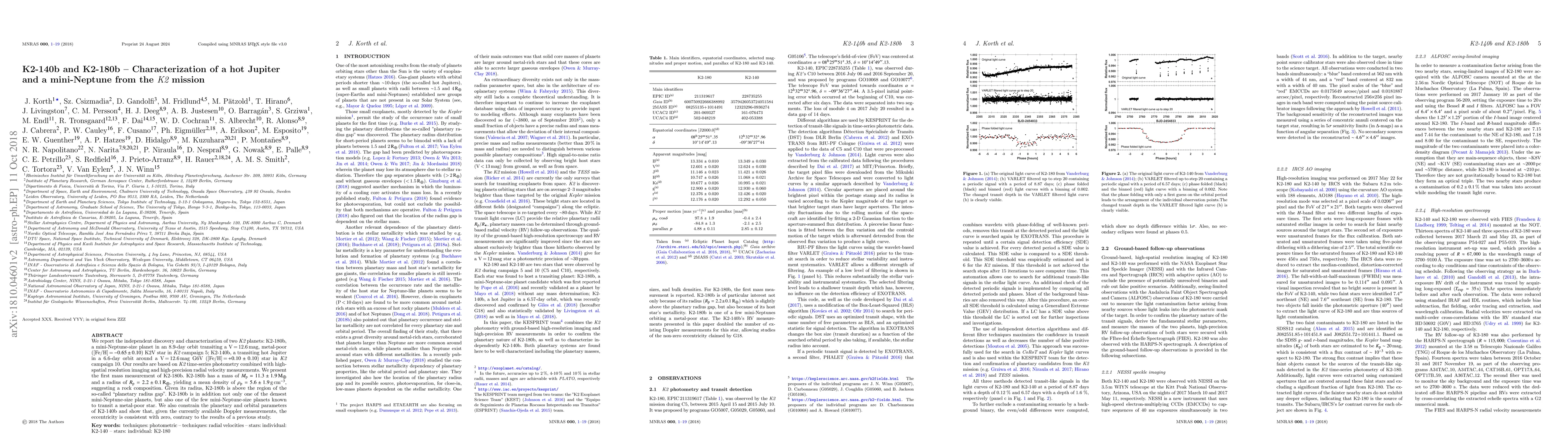 This paper characterizes two K2 mission exoplanets: K2-180b, a dense mini-Neptune transiting a metal-poor star, and K2-140b, a hot Jupiter with a nearly circular orbit around a metal-rich star. K2-180b's mass and radius suggest a rocky composition, while K2-140b's eccentricity is found to be consistent with zero.
