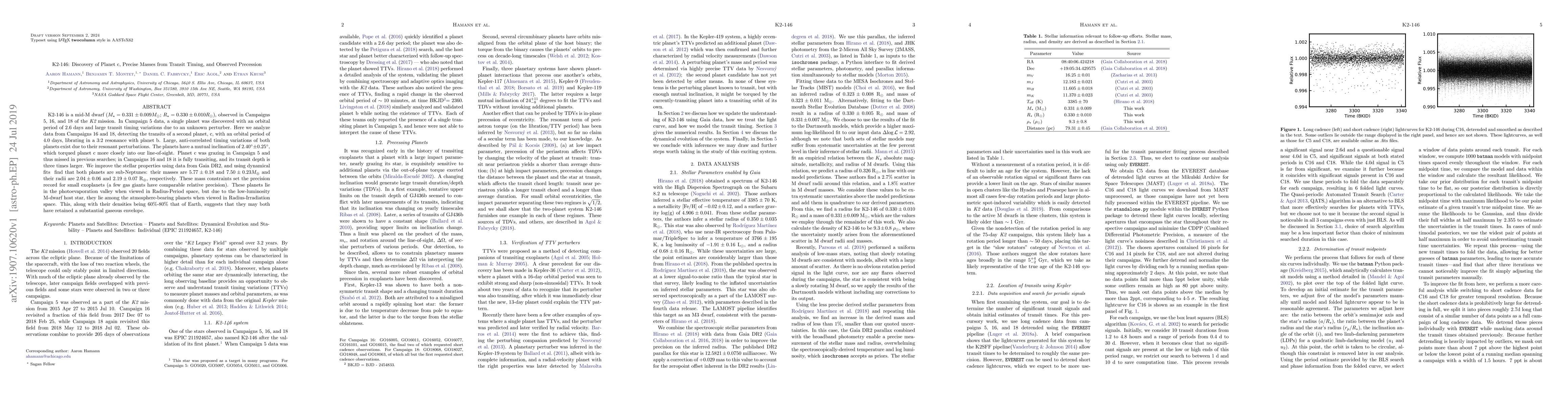 The K2-146 system hosts two sub-Neptune planets, with precise masses determined through transit timing variations and observed precession, revealing a 3:2 orbital resonance and suggesting both may retain substantial gaseous envelopes.