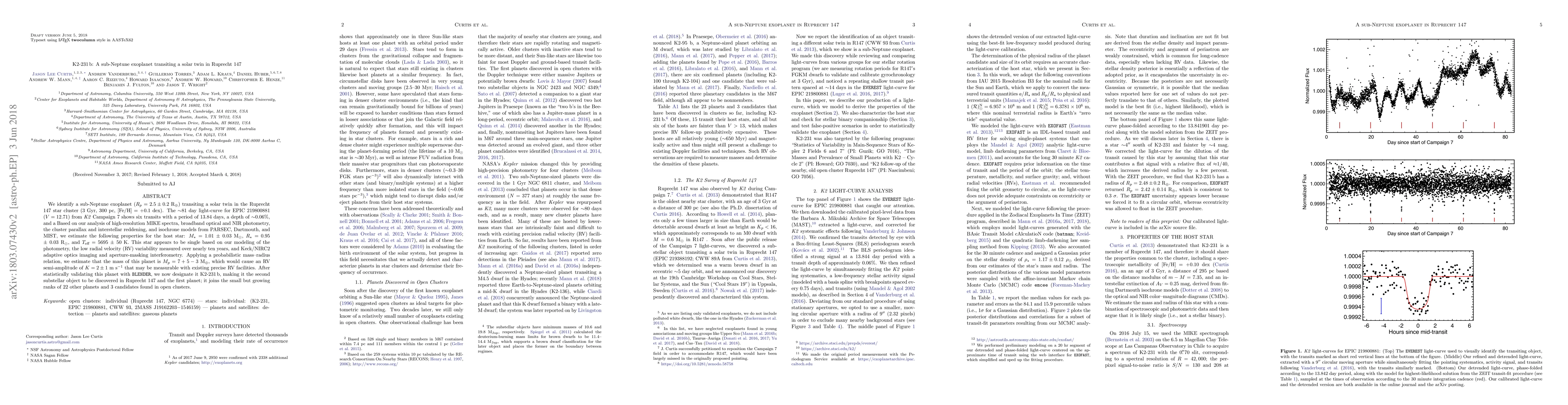 K2-231 b is a sub-Neptune exoplanet with a radius of 2.5 R⊕ transiting a solar twin in the Ruprecht 147 star cluster, discovered via K2 Campaign 7. The planet orbits with a period of 13.84 days and has a mass estimated at 7 M⊕.
