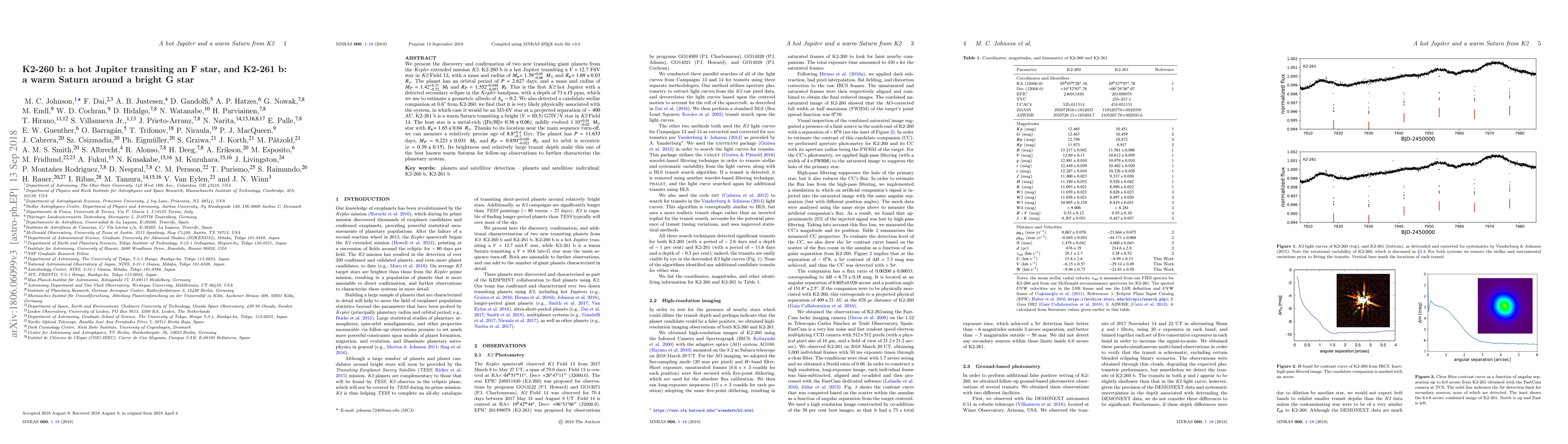 The paper reports the discovery of two transiting giant planets: K2-260 b, a hot Jupiter orbiting an F star, and K2-261 b, a warm Saturn around a G star. K2-260 b exhibits a secondary eclipse and a geometric albedo, while K2-261 b, with an eccentric orbit, is well-suited for follow-up observations.