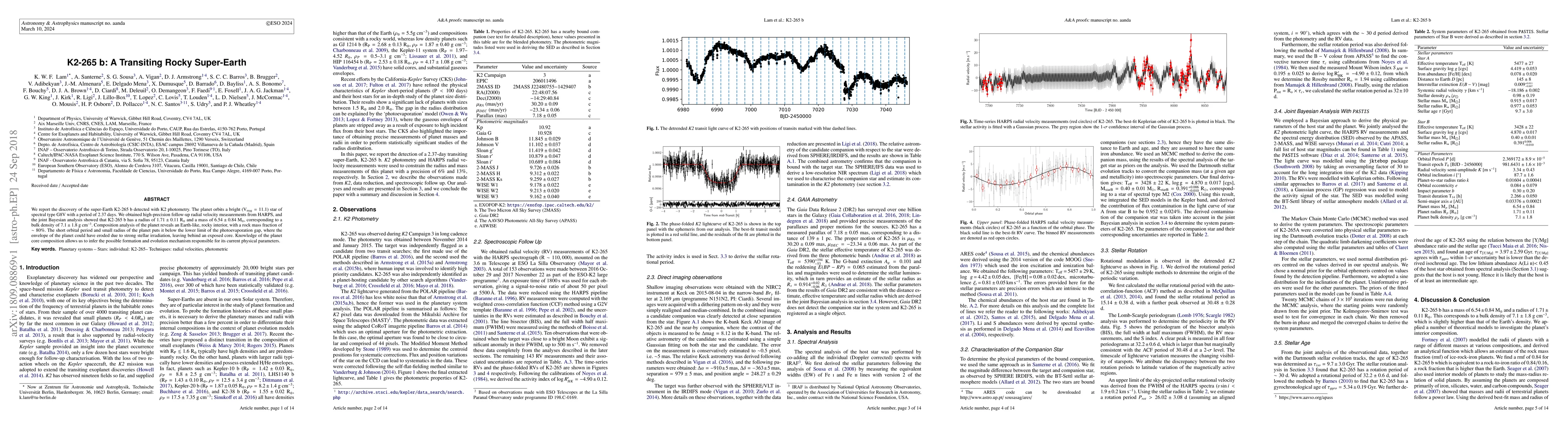 K2-265 b is a rocky super-Earth discovered via K2 photometry and confirmed with HARPS radial velocity measurements, orbiting a G8V star with a period of 2.37 days. Its composition suggests an Earth-like, predominantly rocky interior, challenging models of photoevaporation.
