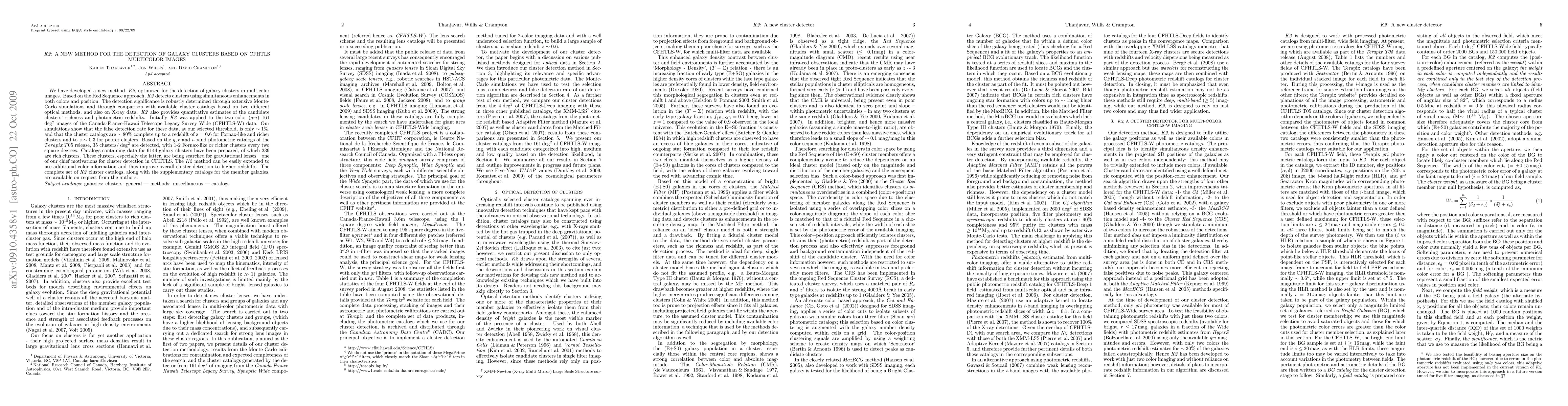A new method called K2 detects galaxy clusters in multicolor images using a combination of color enhancements and position, with a false detection rate of ~1% and high completeness rates.
