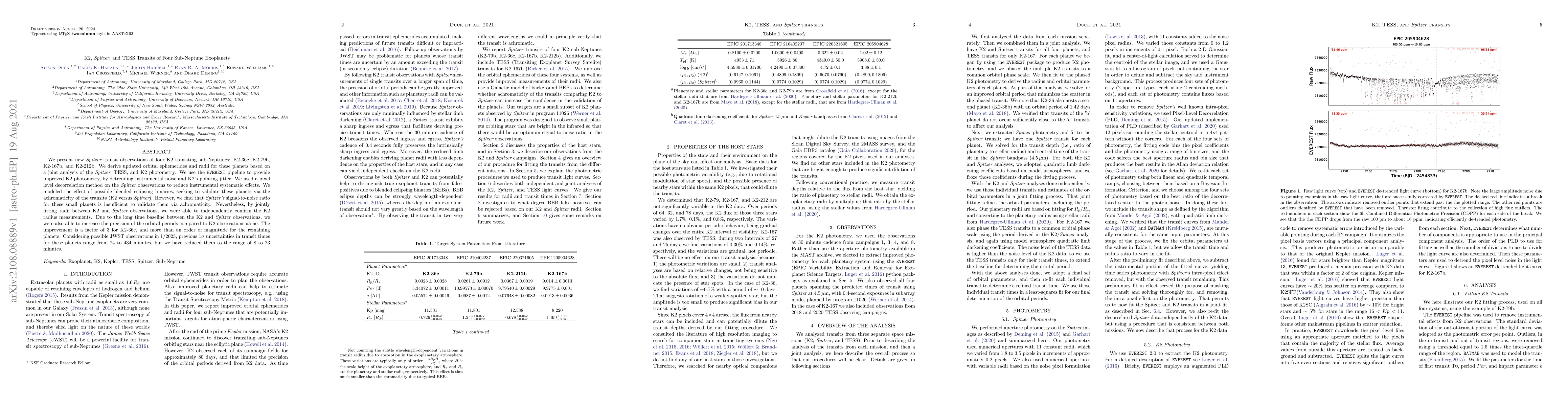 This study presents updated orbital ephemerides and radii for four sub-Neptune exoplanets (K2-36c, K2-79b, K2-167b, K2-212b) using combined Spitzer, TESS, and K2 transit data. Despite insufficient signal-to-noise ratio to validate the planets via achromaticity, the joint analysis confirmed K2 radius measurements and significantly improved orbital period precision.