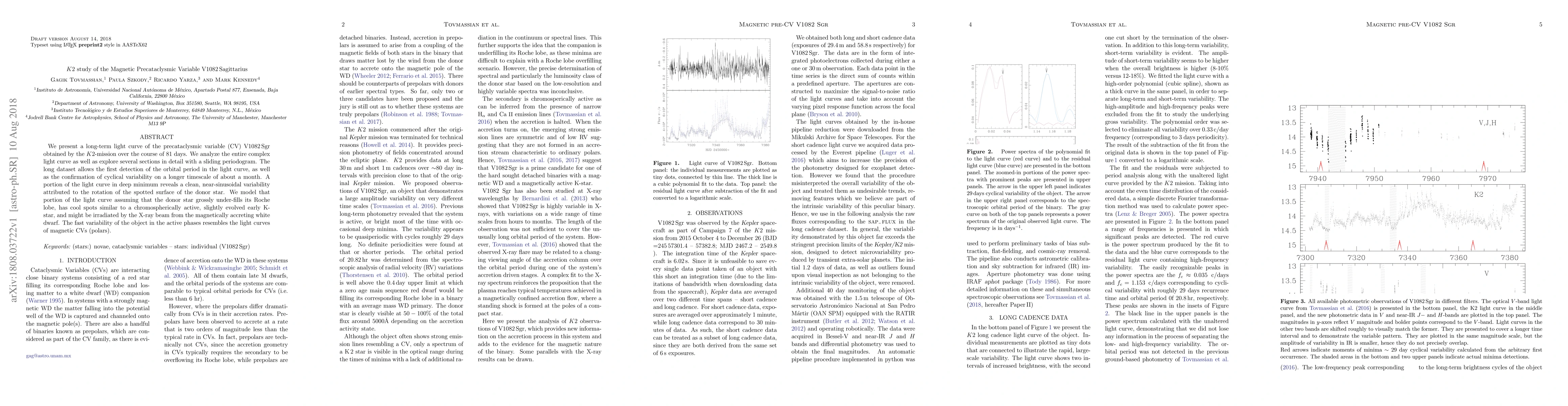 We present a long-term light curve of the precataclysmic variable (CV) V1082 Sgr obtained by the K2-mission over the course of 81 days. We analyze the entire complex light curve as well as explore several sections in detail with a sliding periodogram. The long dataset allows the first detection of the orbital period in the light curve, as well as the confirmation of cyclical variability on a longer timescale of about a month. A portion of the light curve in deep minimum reveals a clean, near-sinusoidal variability attributed to the rotation of the spotted surface of the donor star. We model that portion of the light curve assuming that the donor star grossly under-fills its Roche lobe, has cool spots similar to a chromospherically active, slightly evolved early K-star, and might be irradiated by the X-ray beam from the magnetically accreting white dwarf. The fast variability of the object in the active phases resembles the light curves of magnetic CVs (polars).
