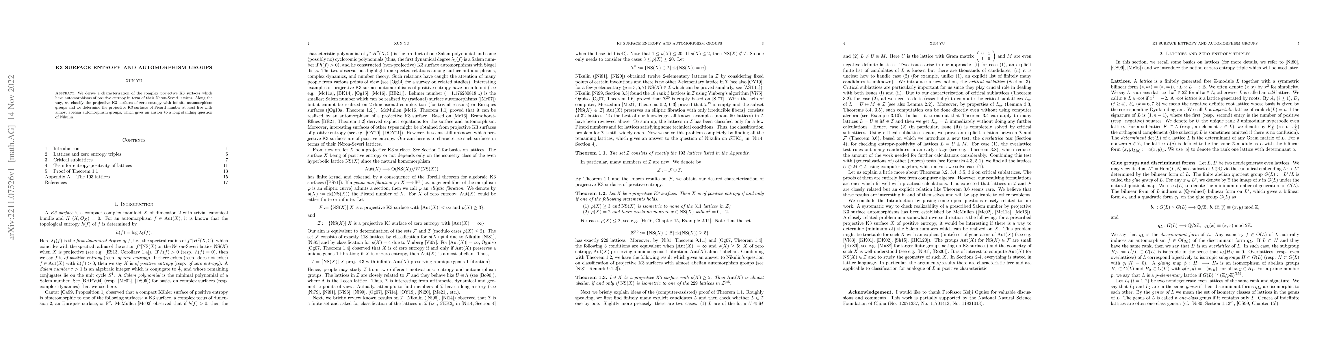 This paper characterizes complex projective K3 surfaces with automorphisms of positive entropy via their N\'eron-Severi lattices, and classifies those with zero entropy and infinite automorphism groups, while also addressing a longstanding question regarding K3 surfaces with Picard number at least five and almost abelian automorphism groups.