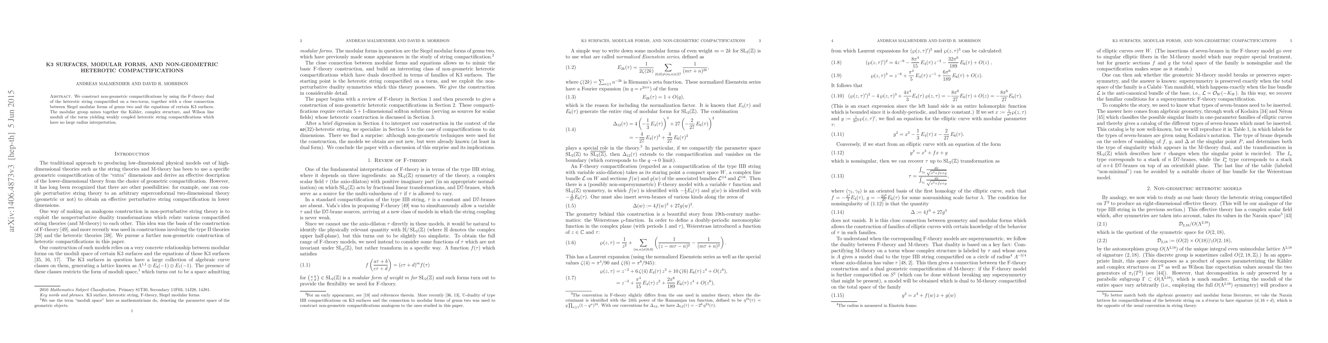 We construct non-geometric compactifications by using the F-theory dual of the heterotic string compactified on a two-torus, together with a close connection between Siegel modular forms of genus two and the equations of certain K3 surfaces. The modular group mixes together the K\"ahler, complex structure, and Wilson line moduli of the torus yielding weakly coupled heterotic string compactifications which have no large radius interpretation.