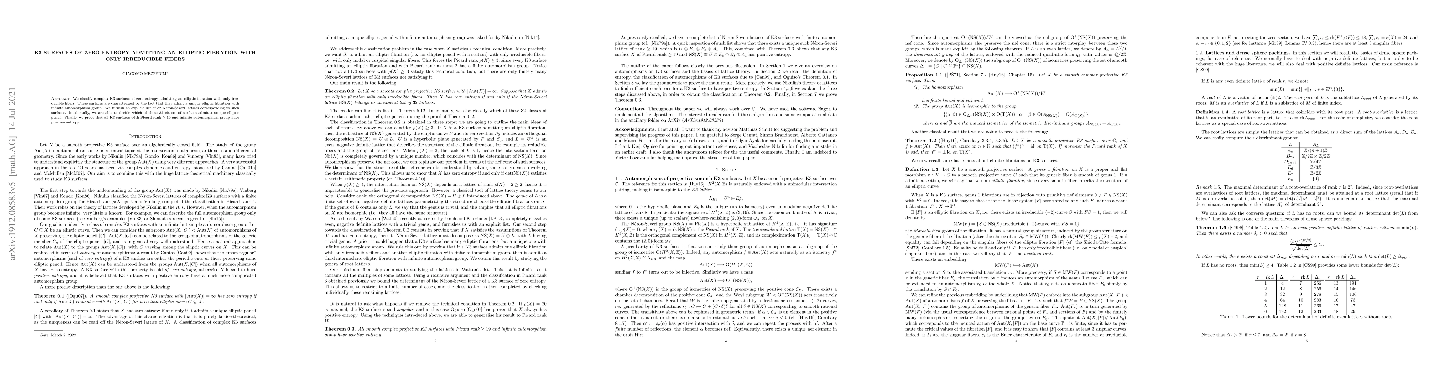 This paper classifies complex K3 surfaces of zero entropy with an elliptic fibration featuring only irreducible fibers, providing an explicit list of 32 corresponding Néron-Severi lattices and proving that all K3 surfaces with Picard rank ≥19 and infinite automorphism group have positive entropy.