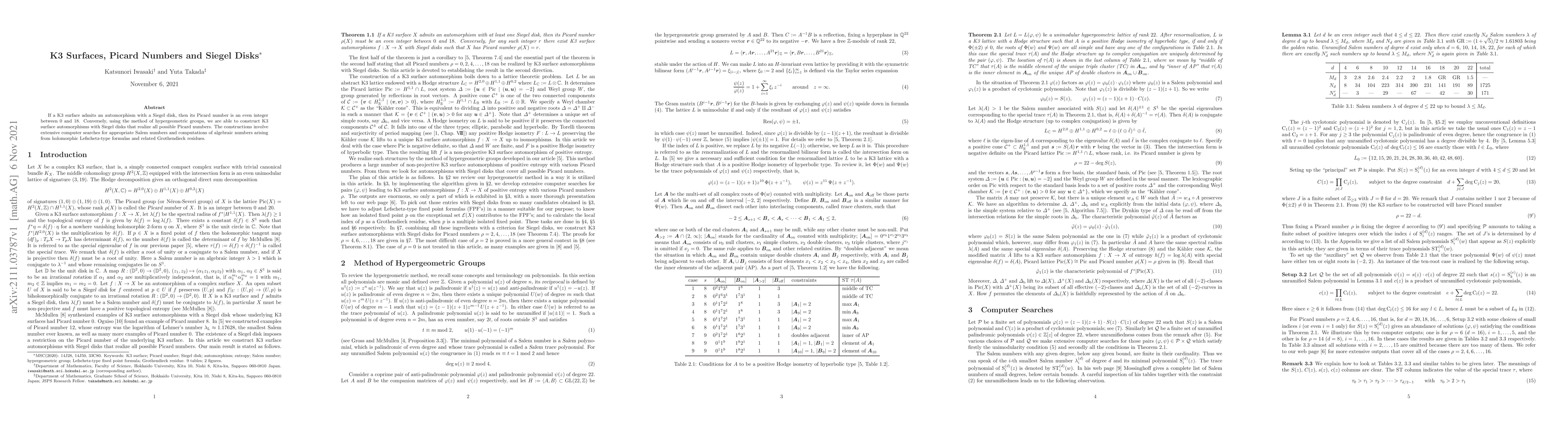 Summary: Research investigates K3 surfaces with automorphisms featuring Siegel disks, proving their Picard numbers are even integers between 0 and 18, and constructs such surfaces realizing all possible Picard numbers via hypergeometric groups, Salem numbers, and Grothendieck residues.