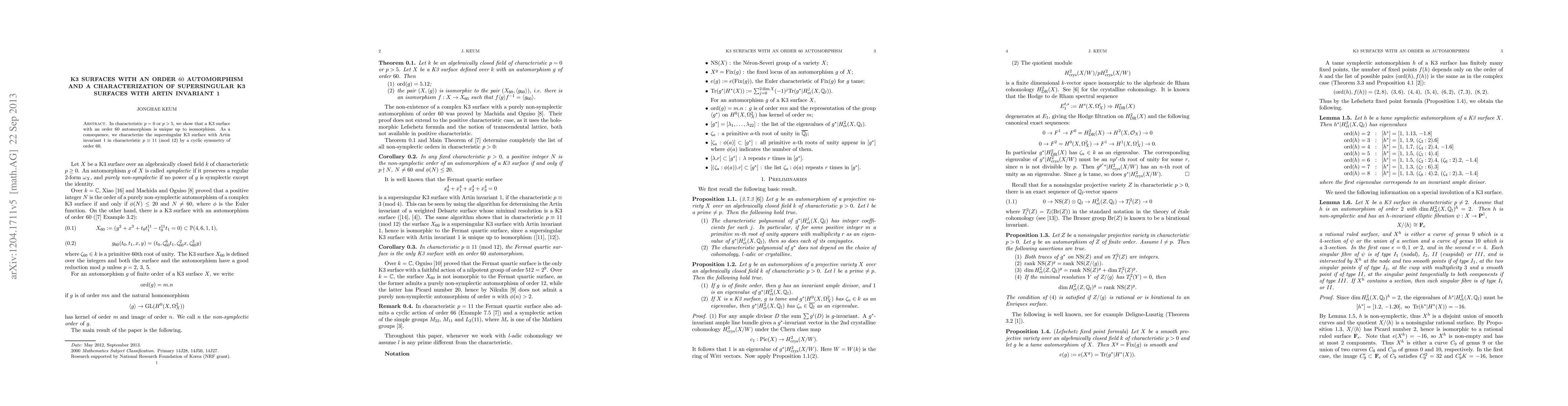 Summary: This paper demonstrates the uniqueness of K3 surfaces with an order 60 automorphism in characteristic $p=0$ or $p>5$, and characterizes supersingular K3 surfaces with Artin invariant 1 in characteristic $p=11$ (mod 12) through a cyclic symmetry of order 60.