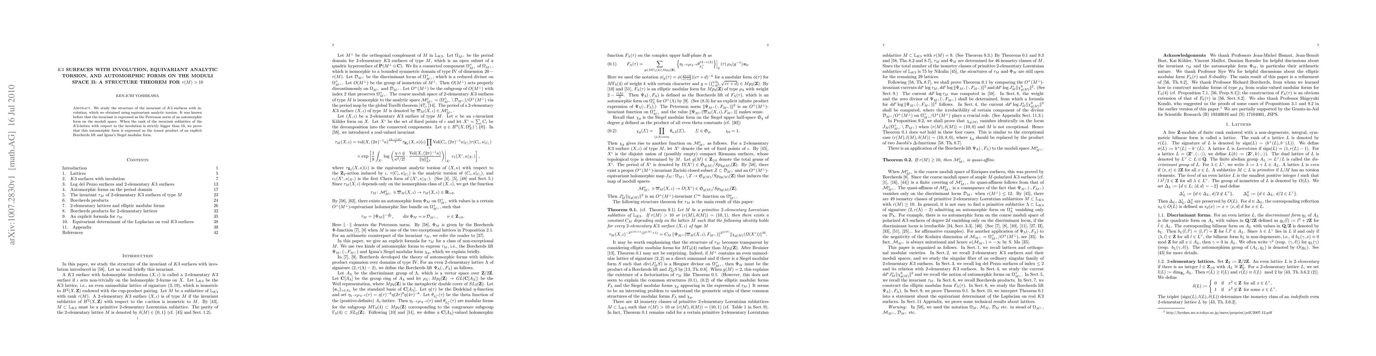 This paper proves a structure theorem for K3 surfaces with involution when the rank of the invariant sublattice exceeds 10, showing that the associated equivariant analytic torsion corresponds to the tensor product of an explicit Borcherds lift and Igusa's Siegel modular form.