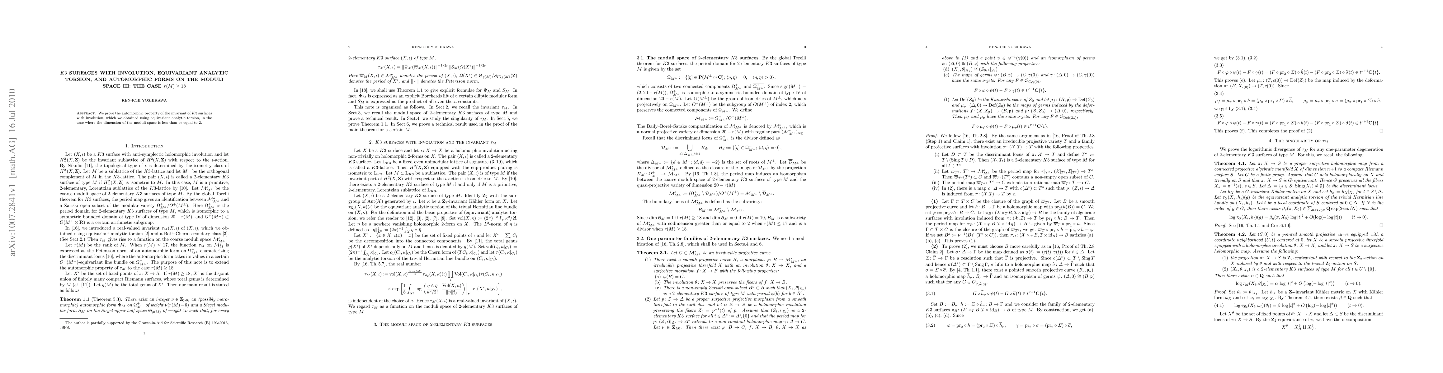 This paper proves the automorphic property of an invariant for K3 surfaces with involution, derived via equivariant analytic torsion, specifically when the dimension of the moduli space is at least 18. The focus is on the mathematical framework and analytical techniques involved.