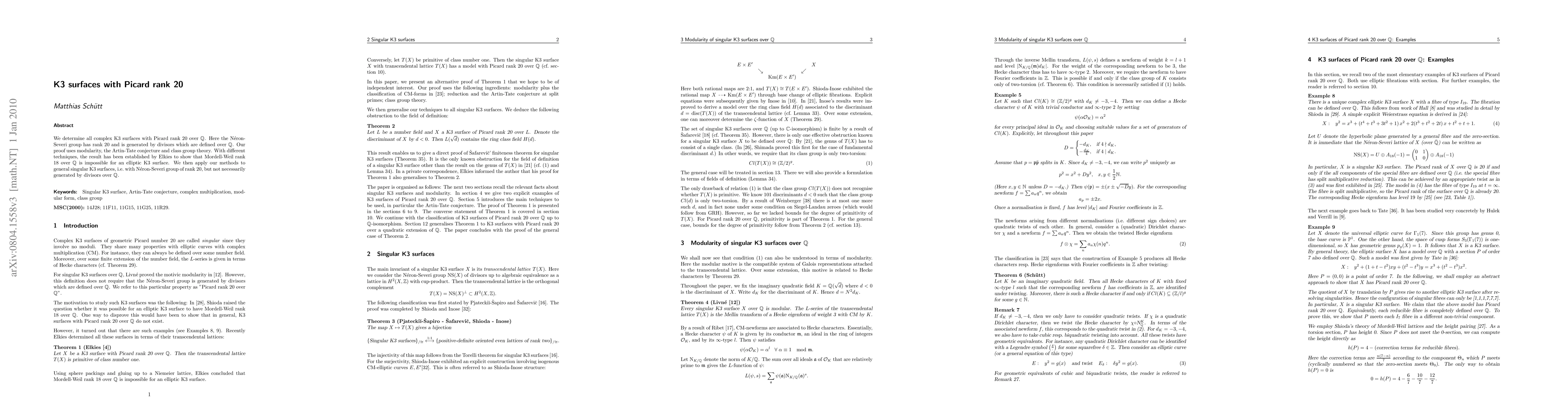 This paper identifies all complex K3 surfaces with Picard rank 20 over Q, leveraging modularity, the Artin-Tate conjecture, and class group theory. It extends results previously used to demonstrate that Mordell-Weil rank 18 over Q is impossible for elliptic K3 surfaces.