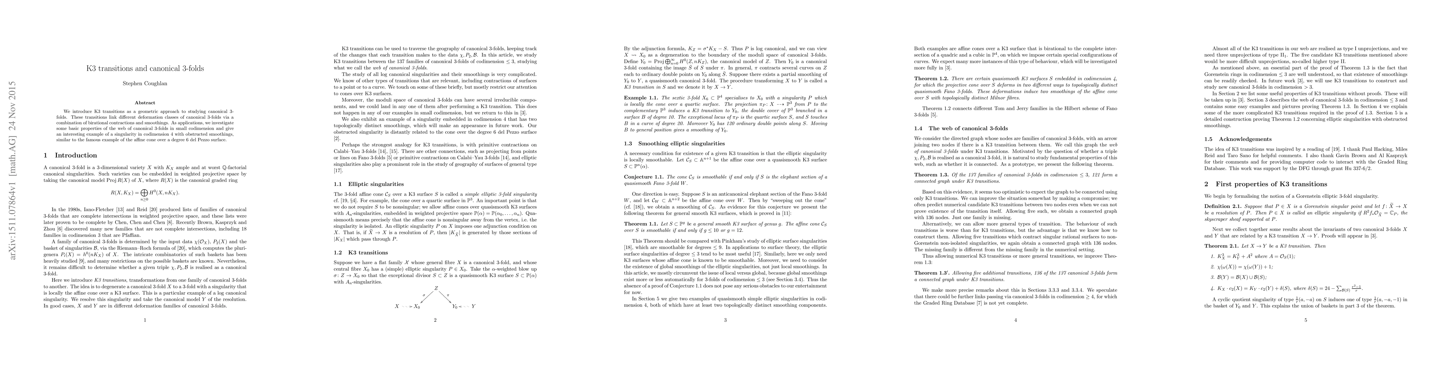 We introduce K3 transitions as a geometric approach to studying canonical 3-folds. These transitions link different deformation classes of canonical 3-folds via a combination of birational contractions and smoothings. As applications, we investigate some basic properties of the web of canonical 3-folds in small codimension and give an interesting example of a singularity in codimension 4 with obstructed smoothings, similar to the famous example of the affine cone over a degree 6 del Pezzo surface.