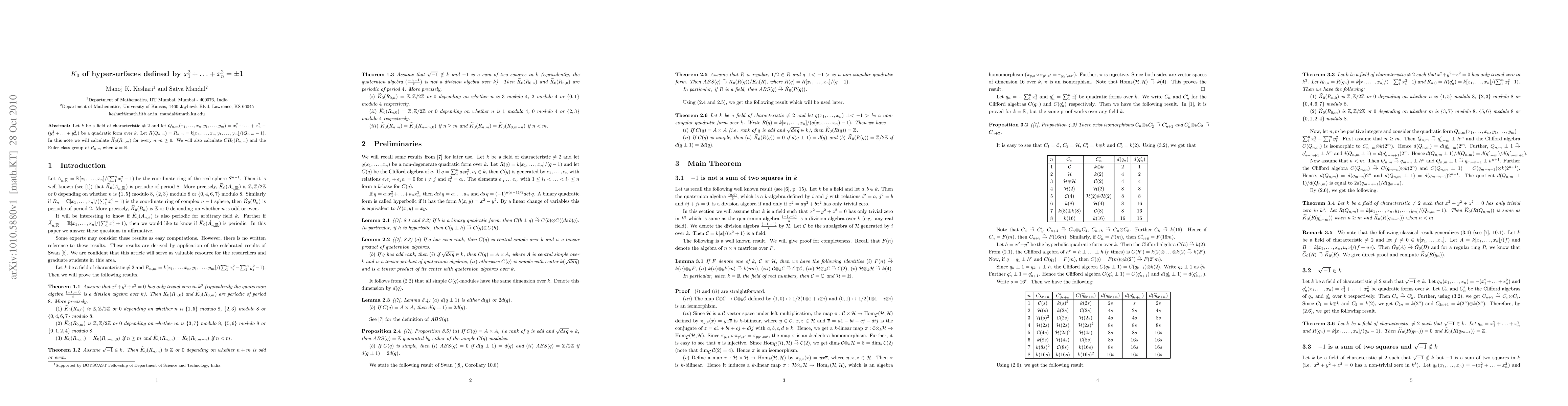 This paper calculates the Grothendieck group $\wt K_0$ of the coordinate ring $R_{n,m}$ for hypersurfaces defined by the quadratic form $Q_{n,m}(x_1, ..., x_n, y_1, ..., y_m) = x_1^2 + ... + x_n^2 - (y_1^2 + ... + y_m^2) = 1$ over a field $k$ of characteristic not equal to 2.