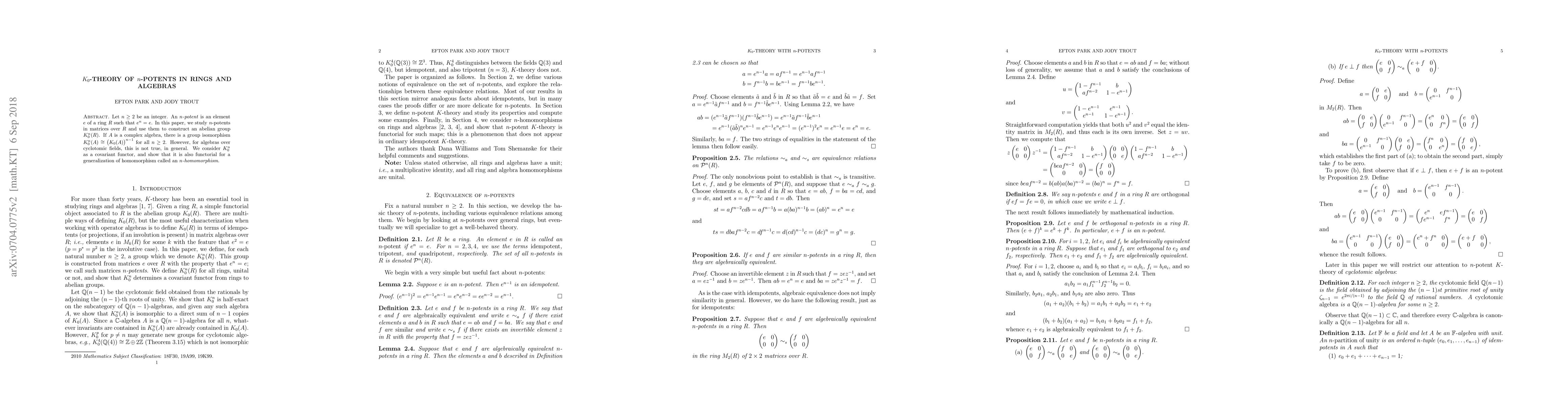 This paper studies n-potents, elements e in a ring R satisfying e^n = e, and constructs an abelian group K_0^n(R) from them, focusing on matrices over R. It establishes a group isomorphism K_0^n(A) ≅ (K_0(A))^(n-1) for complex algebras A, but shows this doesn't generally hold for algebras over cyclotomic fields. The study also treats K_0^n as a covariant functor, demonstrating its functoriality for n-homomorphisms.