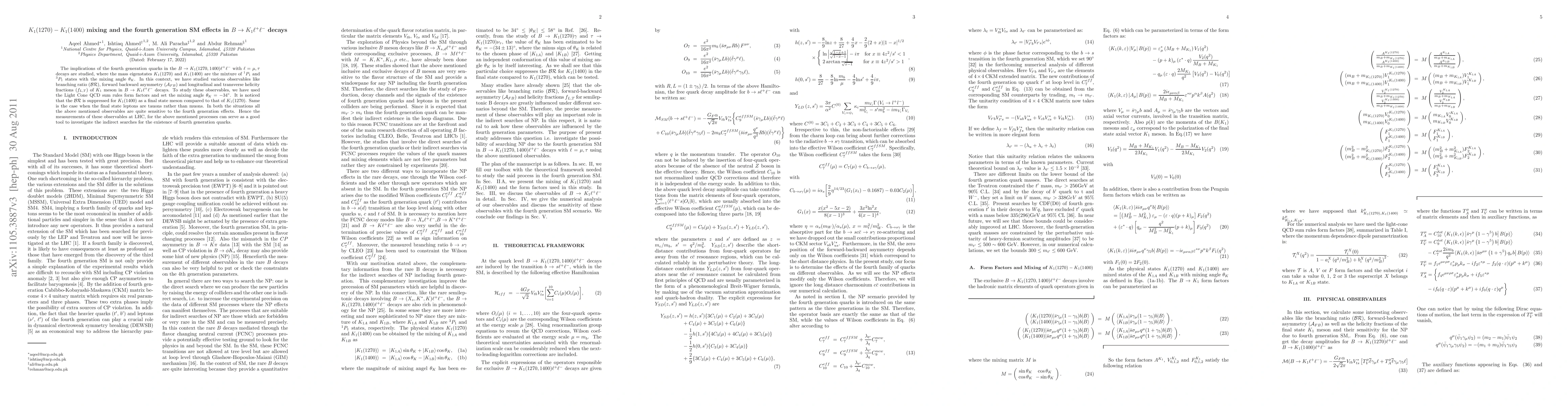 The implications of the fourth generation quarks in the B-->K_{1}(1270,1400)l^{+}l^{-} with l=mu, tau decays are studied, where the mass eigenstates K_{1}(1270) and K_{1}(1400) are the mixture of ^{1}{P}_{1} and ^{3}{P}_{1} states with the mixing angle \theta_{K}. In this context, we have studied various observables like branching ratio (BR), forward backward asymmetry (A_{FB}) and longitudinal and transverse helicity fractions (f_{L,T}) of K_{1} meson in B-->K_{1}l^{+}l^{-} decays. To study these observables, we have used the Light Cone QCD sum rules form factors and set the mixing angle \theta_{K}=-34^{o}. It is noticed that the BR is suppressed for K_{1}(1400) as a final state meson compared to that of K_{1}(1270). Same is the case when the final state leptons are tauons rather than muons. In both the situations all the above mentioned observables are quite sensitive to the fourth generation effects. Hence the measurements of these observables at LHC, for the above mentioned processes can serve as a good tool to investigate the indirect searches for the existence of fourth generation quarks.