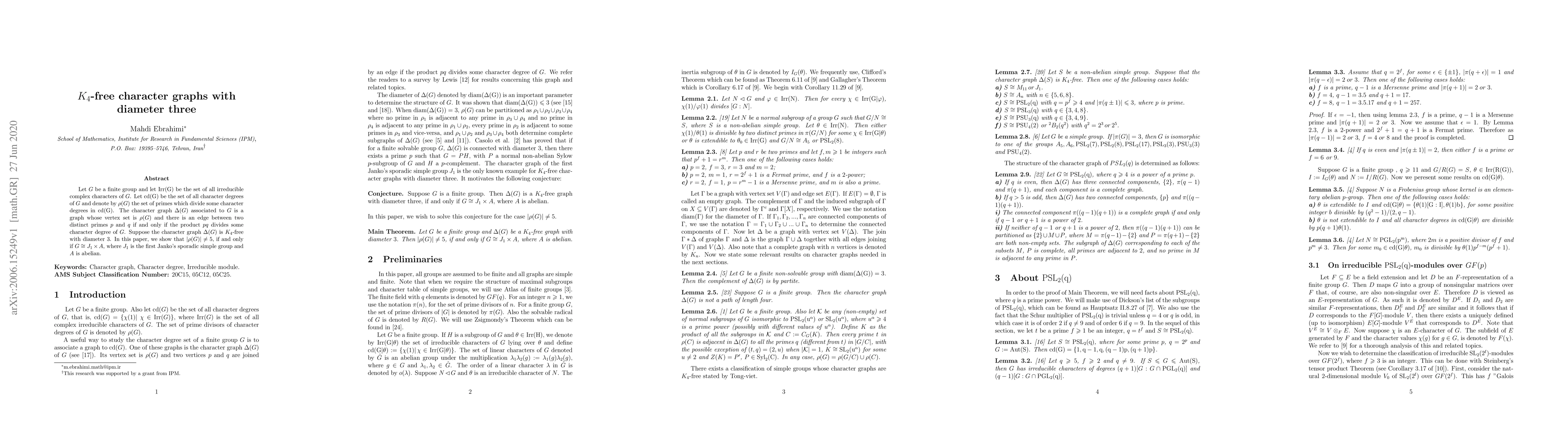 This paper investigates $K_4$-free character graphs of finite groups with diameter three, proving that such graphs cannot have five vertices unless the group is isomorphic to the direct product of the first Janko sporadic simple group and an abelian group.