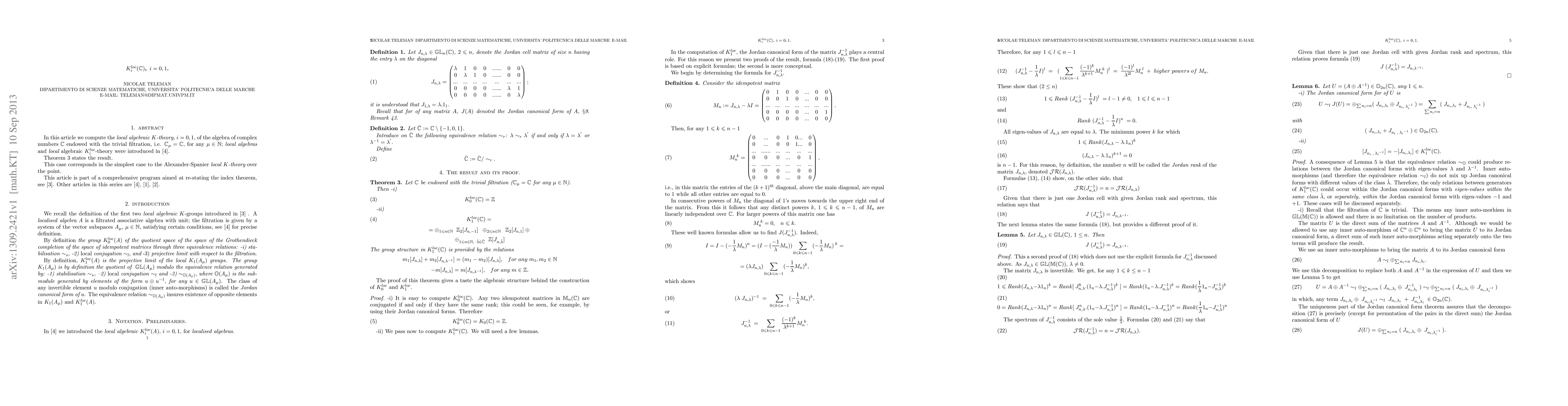 In this article we compute the {\em local algebraic $K$-theory}, $ i = 0, 1$, of the algebra of complex numbers $\mathbb{C}$ endowed with the trivial filtration, i.e. $\mathbb{C}_{\mu}= \mathbb{C}$, for any $\mu \in \mathbb{N}$; {\em local algebras} and {\em local} algebraic $K^{loc}_{i}$-theory were introduced in \cite{Teleman_arXiv_IV}. \par Theorem 3 states the result. \par This case corresponds in the simplest case to the Alexander-Spanier {\em local $K$-theory} over the point. \par This article is part of a comprehensive program aimed at re-stating the index theorem, see \cite{Teleman_arXiv_III}. Other articles in this series are \cite{Teleman_arXiv_IV}, \cite{Teleman_arXiv_I}, \cite{Teleman_arXiv_II}.