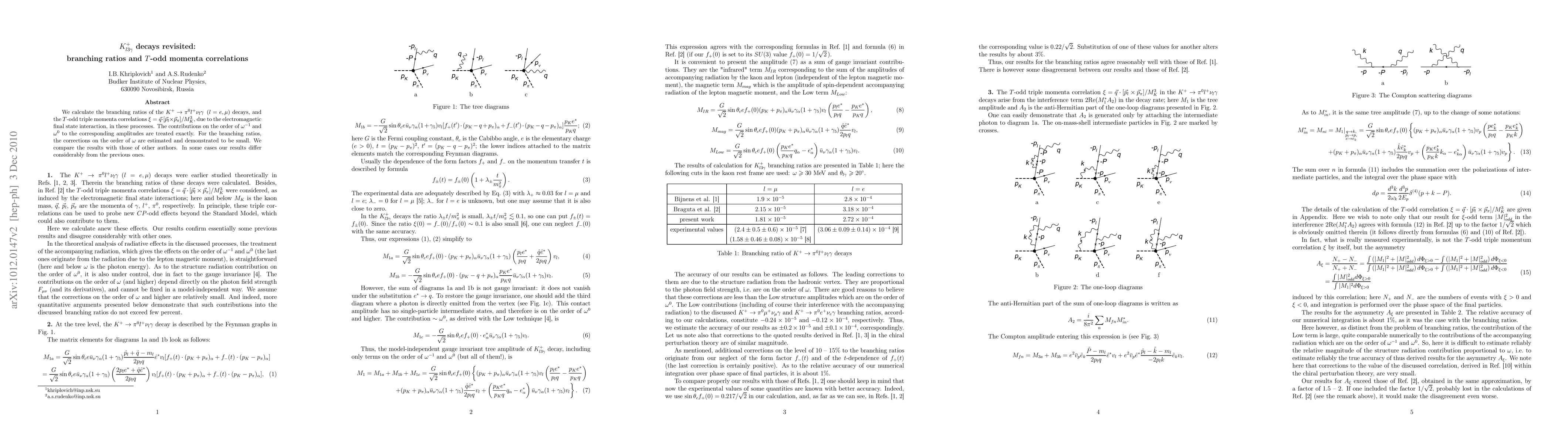 We calculate the branching ratios of the $K^+ \to \pi^0 l^+ \nu_l\gamma (l = e, \mu)$ decays, and the T-odd triple momenta correlations $\xi=\vec{q}\cdot[\vec{p}_l \times \vec{p}_\pi]/M^3_K$, due to the electromagnetic final state interaction, in these processes. The contributions on the order of $\omega^{-1}$ and $\omega^0$ to the corresponding amplitudes are treated exactly. For the branching ratios, the corrections on the order of $\omega$ are estimated and demonstrated to be small. We compare the results with those of other authors. In some cases our results differ considerably from the previous ones.