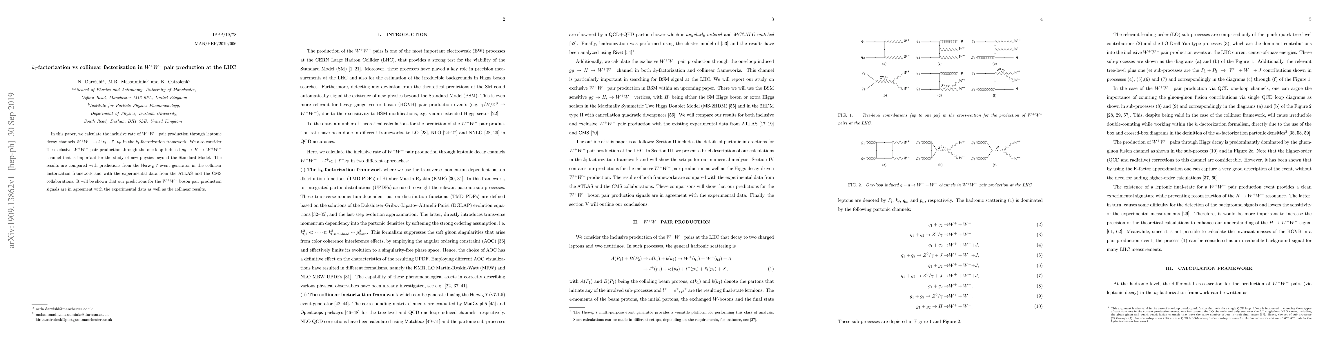 This paper compares $k_t$-factorization and collinear factorization methods for inclusive and exclusive $W^{+}W^{-}$ pair production at the LHC, finding agreement between $k_t$-factorization predictions and both experimental data and collinear results. The study also examines the one-loop induced $gg \to H \to W^+W^-$ channel for new physics beyond the Standard Model.