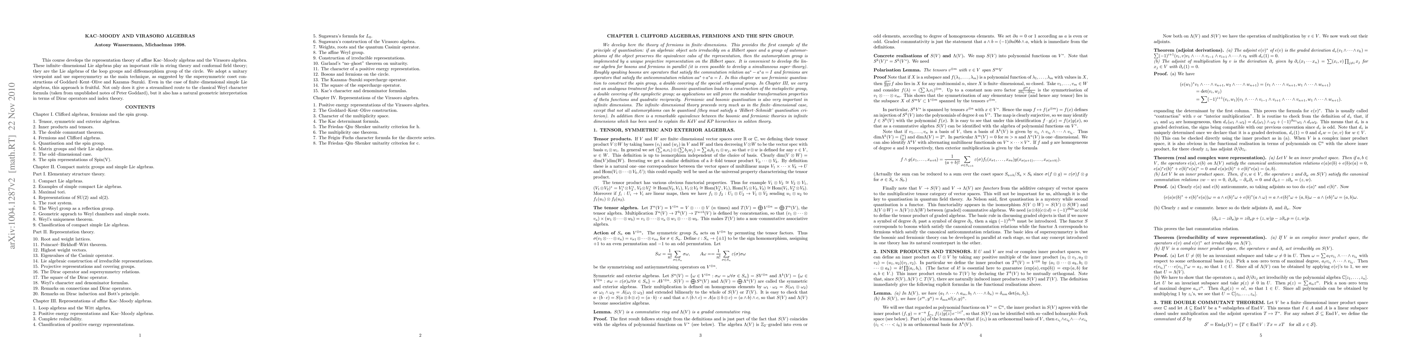 These are the notes for a Part III course given in the University of Cambridge in autumn 1998. They contain an exposition of the representation theory of the Lie algebras of compact matrix groups, affine Kac-Moody algebras and the Virasoro algebra from a unitary point of view. The treatment uses many of the methods of conformal field theory, in particular the Goddard-Kent-Olive construction and the Kazami-Suzuki supercharge operator, a generalisation of the Dirac operator. The proof of the Weyl character formula is taken from unpublished notes of Peter Goddard. The supersymmetric proof of the Kac character formula for affine Kac-Moody algebras was also found independently at roughly the same time by Greg Landweber in his Harvard Ph.D. dissertation. One of the main novelties of this approach is a very rapid proof of the Feigin-Fuchs character formula for the discrete series representations of the Virasoro algebra. It relies only on the first part of the Friedan-Qiu-Shenker unitarity theorem placing restrictions on the parameter h. Their result, which only uses elementary properties of plane curves, is presented in detail in these notes along with the somewhat harder result for c. A substantially shorter treatment is possible if the final goal is just the Feigin-Fuchs formula, since in that case only the representation theory of affine sl(2) is needed (cf the MSRI summer course given in 2000, http://www.msri.org/publications/ln/msri/2000/opal/wassermann/). The same method has been applied by S. Palcoux to the Neveu-Schwarz algebra and also works for the N=2 superconformal algebra.