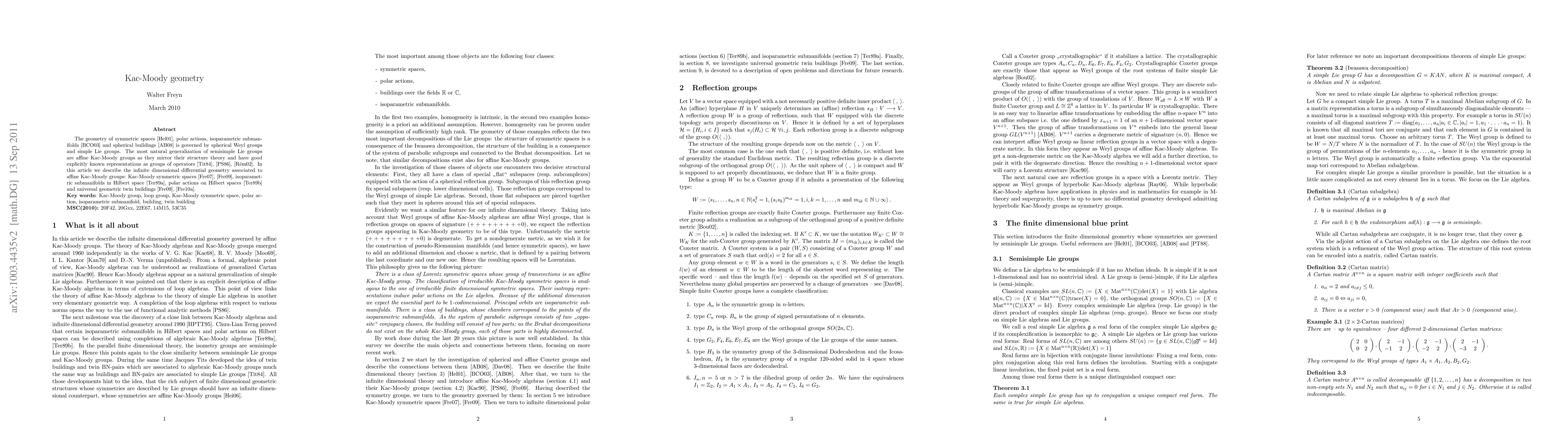 The geometry of symmetric spaces, polar actions, isoparametric submanifolds and spherical buildings is governed by spherical Weyl groups and simple Lie groups. A natural generalization of semisimple Lie groups are affine Kac-Moody groups as they mirror their structure theory and have good explicitely known representations as groups of operators. In this article we describe the infinite dimensional differential geometry associated to Kac-Moody groups: Kac-Moody symmetric spaces, isoparametric submanifolds in Hilbert space, polar actions on Hilbert spaces and universal geometric twin buildings.