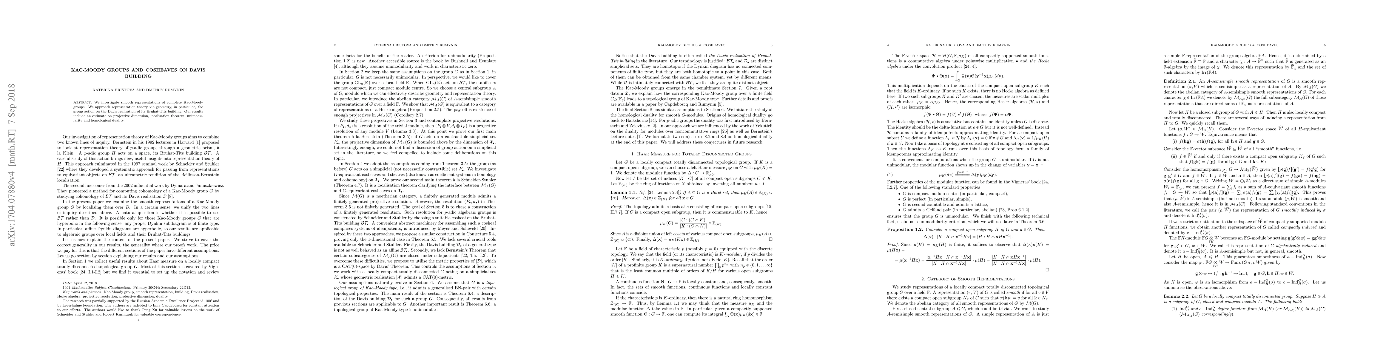 This paper explores smooth representations of complete Kac-Moody groups through geometric methods, focusing on their action on the Davis realization of the Bruhat-Tits building, and presents results including an estimate on projective dimension, a localization theorem, unimodularity, and homological duality.