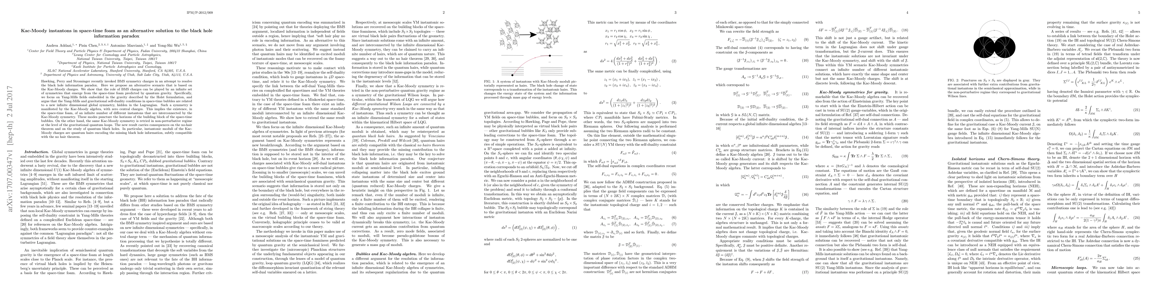 Hawking, Perry and Strominger recently invoked BMS symmetry charges in an attempt to resolve the black hole information paradox. Here we propose an alternative scenario that is based on the Kac-Moody charges. We show that the role of BMS charges can be played by an infinite set of symmetries that emerge from the space-time foam predicted by quantum gravity. Specifically, we focus on Yang-Mills fields embedded in the gravity described by the Holst formulation, and argue that the Yang-Mills and gravitational self-duality conditions in space-time bubbles are related to a new infinite dimensional global symmetry, hidden in the Lagrangian. Such a symmetry is manifested by the Kac-Moody algebra, with zero central charges. This implies the existence, in the space-time foam, of an infinite number of different instantons that are interconnected by the Kac-Moody symmetry. These modes puncture the horizons of the building block of the space-time bubbles. On the other hand, the same Kac-Moody symmetry is retried in non-perturbative regime at the level of the gravitational quantum loops. The new result carries consequences on the no-hair theorem and on the study of quantum black holes. In particular, instantonic moduli of the Kac-Moody charges are quantum hairs encoding the missing black hole information, subtly compatible with the no hair theorem.