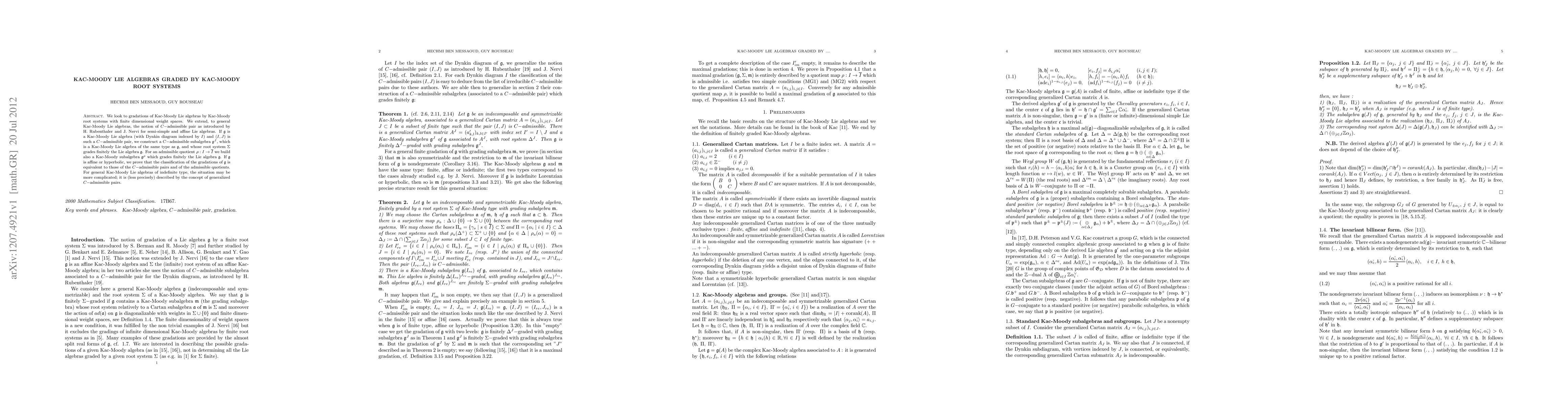 This paper explores gradations of Kac-Moody Lie algebras by Kac-Moody root systems with finite-dimensional weight spaces. It extends the notion of C-admissible pairs to general Kac-Moody algebras, constructing associated subalgebras that grade the Lie algebra finitely.