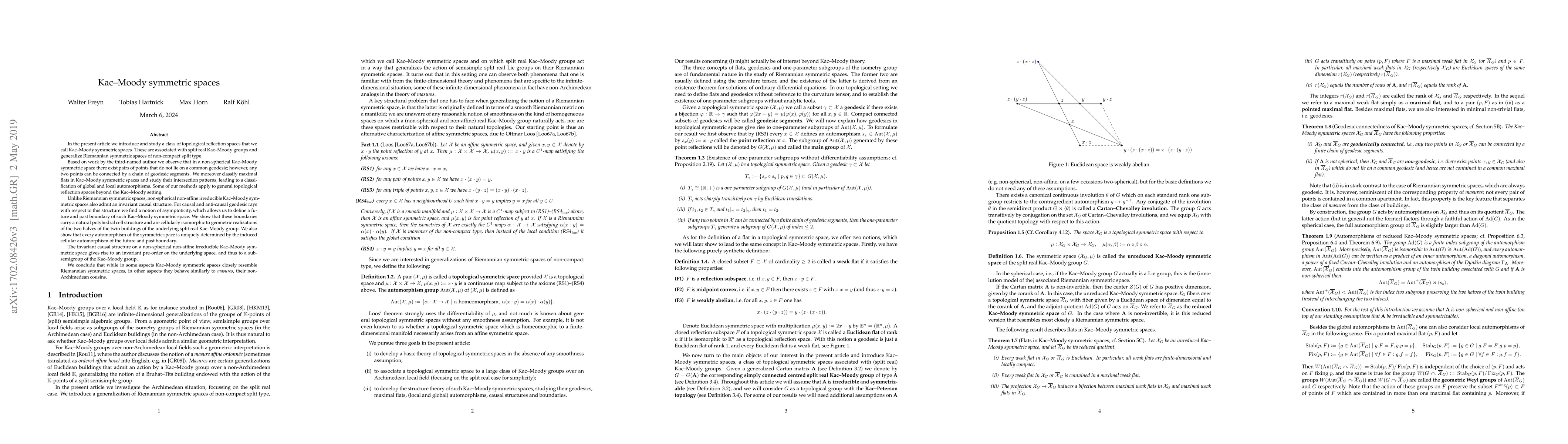 In the present article we introduce and study a class of topological reflection spaces that we call Kac-Moody symmetric spaces. These generalize Riemannian symmetric spaces of non-compact type. We observe that in a non-spherical Kac-Moody symmetric space there exist pairs of points that do not lie on a common geodesic; however, any two points can be connected by a chain of geodesic segments. We moreover classify maximal flats in Kac-Moody symmetric spaces and study their intersection patterns, leading to a classification of global and local automorphisms. Unlike Riemannian symmetric spaces, non-spherical non-affine irreducible Kac-Moody symmetric spaces also admit an invariant causal structure. For causal and anti-causal geodesic rays with respect to this structure we find a notion of asymptoticity, which allows us to define a future and past boundary of such Kac-Moody symmetric space. We show that these boundaries carry a natural polyhedral structure and are cellularly isomorphic to the halves of the geometric realization of the twin buildings of the underlying split real Kac-Moody group. We also show that every automorphism of the symmetric space is uniquely determined by the induced cellular automorphism of the future and past boundary. The invariant causal structure on a non-spherical non-affine irreducible Kac-Moody symmetric space gives rise to an invariant pre-order on the underlying space, and thus to a subsemigroup of the Kac-Moody group. We conclude that while in some aspects Kac-Moody symmetric spaces closely resemble Riemannian symmetric spaces, in other aspects they behave similarly to ordered affine hovels, their non-Archimedean cousins.