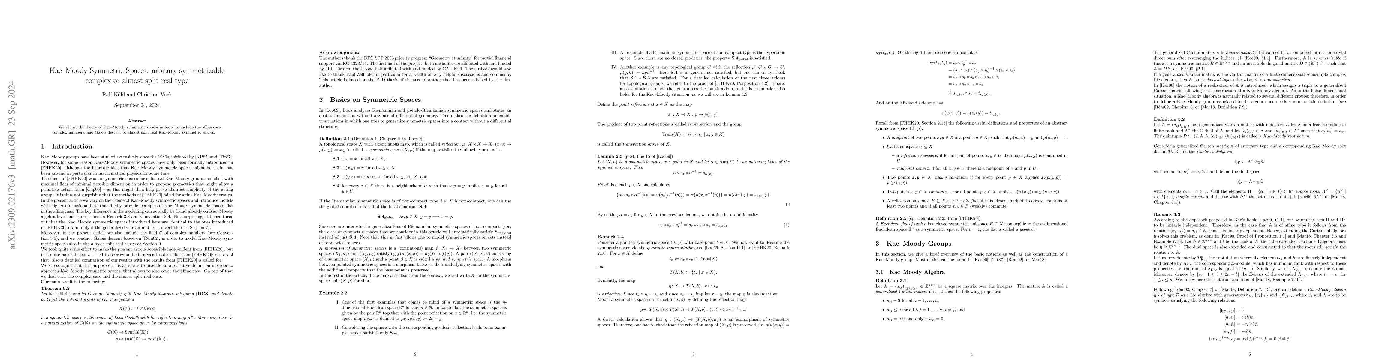 Kac-Moody symmetric spaces have been introduced by Freyn, Hartnick, Horn and the first-named author for centered Kac-Moody groups, that is, Kac-Moody groups that are generated by their root subgroups. In the case of non-invertible generalized Cartan matrices this leads to complications that -- within the approach proposed originally -- cannot be repaired in the affine case. In the present article we propose an alternative approach to Kac-Moody symmetric spaces which for invertible generalized Cartan matrices provides exactly the same concept, which for the non-affine non-invertible case provides alternative Kac-Moody symmetric spaces, and which finally provides Kac-Moody symmetric spaces for affine Kac-Moody groups. In a nutshell, the original intention by Freyn, Hartnick, Horn and K\"ohl was to construct symmetric spaces that likely lead to primitive actions of the Kac-Moody groups; this, of course, cannot work in the affine case as affine Kac-Moody groups are far from simple.