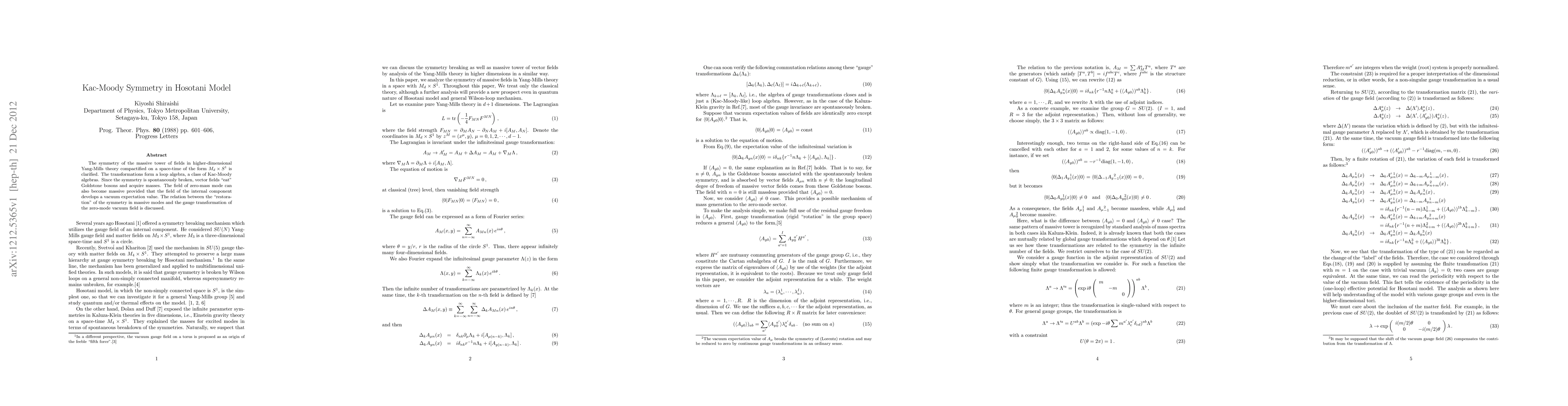 This paper elucidates the Kac-Moody symmetry in the Hosotani model, revealing how the massive fields in higher-dimensional Yang-Mills theory exhibit a loop algebra structure upon compactification on M_d x S^1. It discusses spontaneous symmetry breaking leading to mass acquisition via the "eating" of Goldstone bosons, and explores the "restoration" of symmetry in massive modes tied to the gauge transformation of the zero-mode vacuum field.