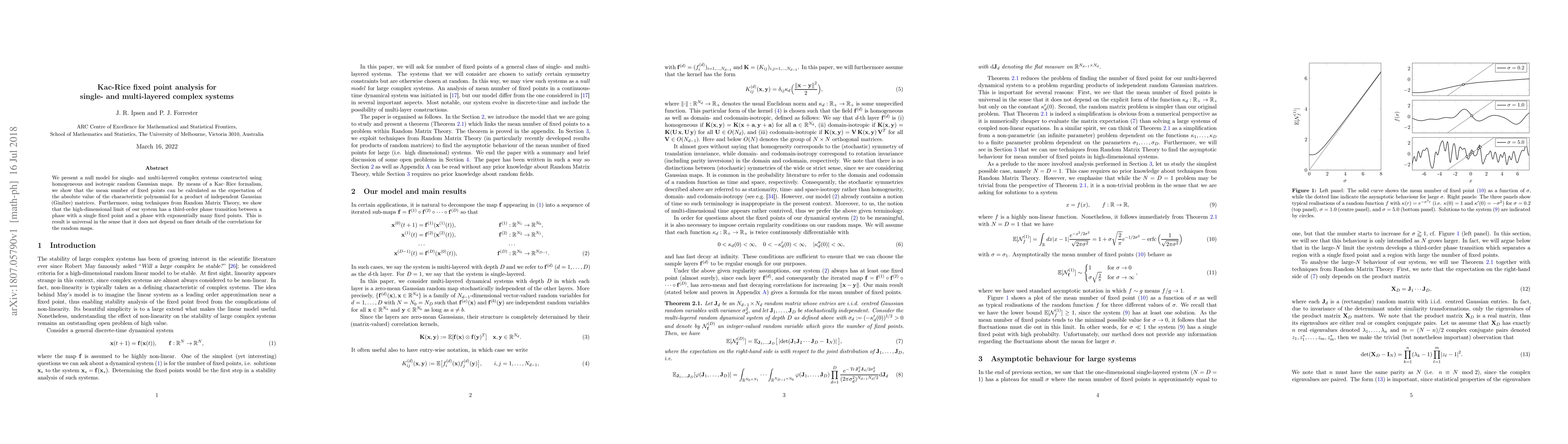 We present a null model for single- and multi-layered complex systems constructed using homogeneous and isotropic random Gaussian maps. By means of a Kac-Rice formalism, we show that the mean number of fixed points can be calculated as the expectation of the absolute value of the characteristic polynomial for a product of independent Gaussian (Ginibre) matrices. Furthermore, using techniques from Random Matrix Theory, we show that the high-dimensional limit of our system has a third-order phase transition between a phase with a single fixed point and a phase with exponentially many fixed points. This is result is universal in the sense that it does not depend on finer details of the correlations for the random maps.