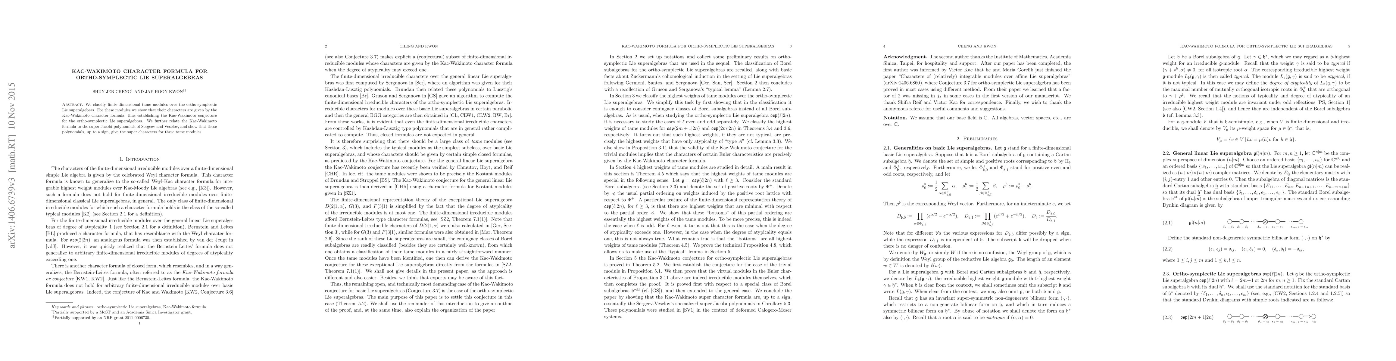 We classify finite-dimensional tame modules over the ortho-symplectic Lie superalgebras. For these modules we show that their characters are given by the Kac-Wakimoto character formula, thus establishing the Kac-Wakimoto conjecture for the ortho-symplectic Lie superalgebras. We further relate the Kac-Wakimoto formula to the super Jacobi polynomials of Sergeev and Veselov, and show that these polynomials, up to a sign, give the super characters for these tame modules.