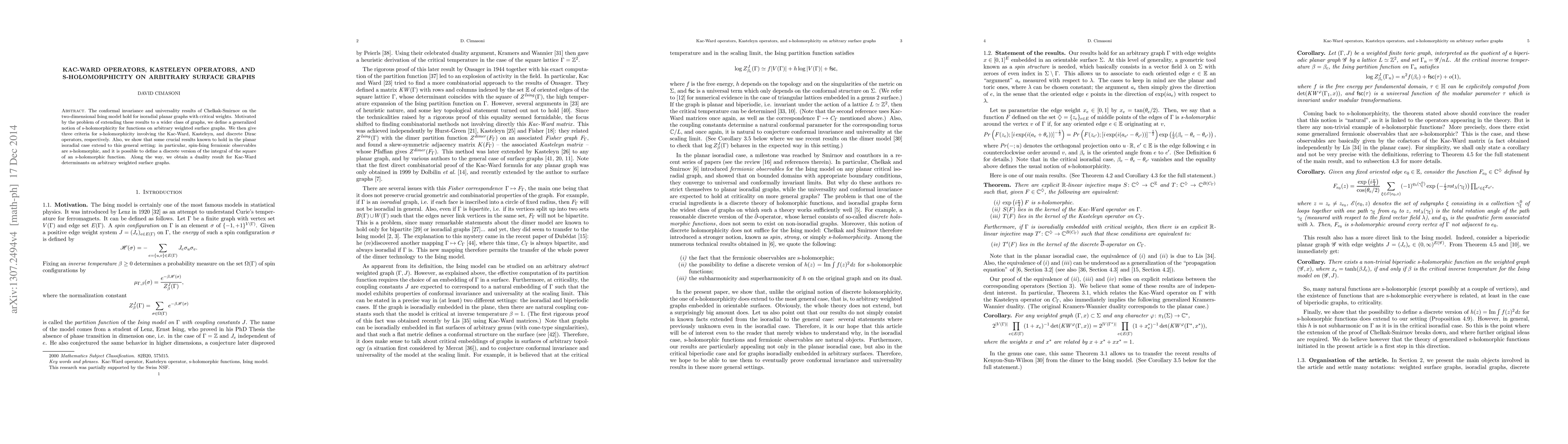 The conformal invariance and universality results of Chelkak-Smirnov on the two-dimensional Ising model hold for isoradial planar graphs with critical weights. Motivated by the problem of extending these results to a wider class of graphs, we define a generalized notion of s-holomorphicity for functions on arbitrary weighted surface graphs. We then give three criteria for s-holomorphicity involving the Kac-Ward, Kasteleyn, and discrete Dirac operators, respectively. Also, we show that some crucial results known to hold in the planar isoradial case extend to this general setting: in particular, spin-Ising fermionic observables are s-holomorphic, and it is possible to define a discrete version of the integral of the square of an s-holomorphic function. Along the way, we obtain a duality result for Kac-Ward determinants on arbitrary weighted surface graphs.