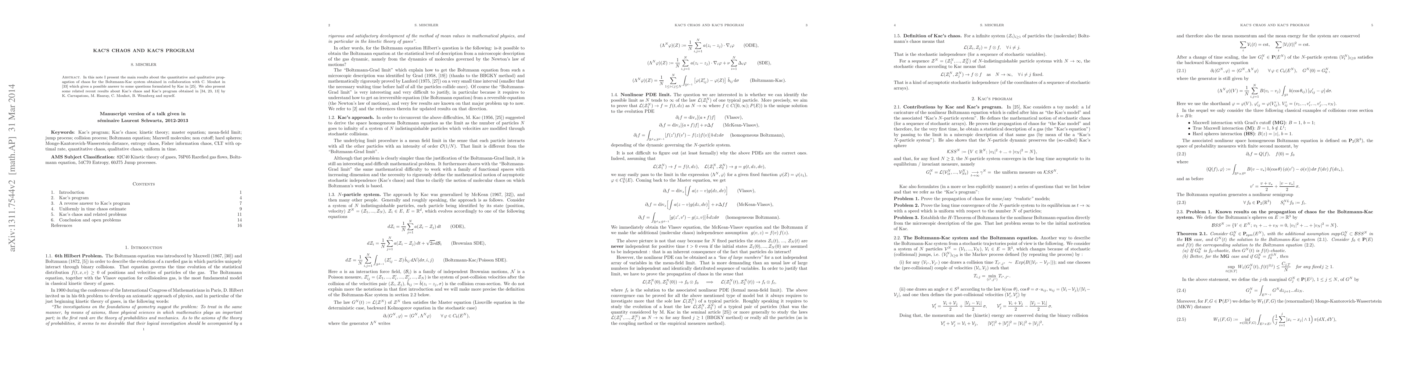 In this note I present the main results about the quantitative and qualitative propagation of chaos for the Boltzmann-Kac system obtained in collaboration with C. Mouhot in \cite{MMinvent} which gives a possible answer to some questions formulated by Kac in \cite{Kac1956}. We also present some related recent results about Kac's chaos and Kac's program obtained in \cite{MMWchaos,HaurayMischler,KleberSphere} by K. Carrapatoso, M. Hauray, C. Mouhot, B. Wennberg and myself.
