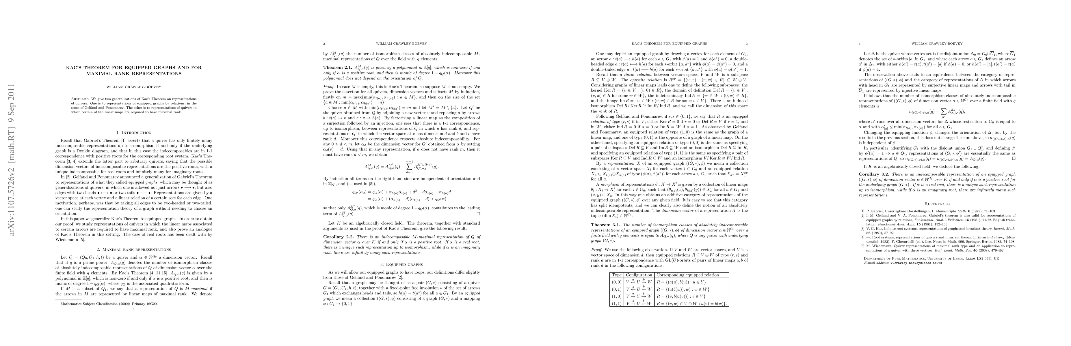 We give two generalizations of Kac's Theorem on representations of quivers. One is to representations of equipped graphs by relations, in the sense of Gelfand and Ponomarev. The other is to representations of quivers in which certain of the linear maps are required to have maximal rank.