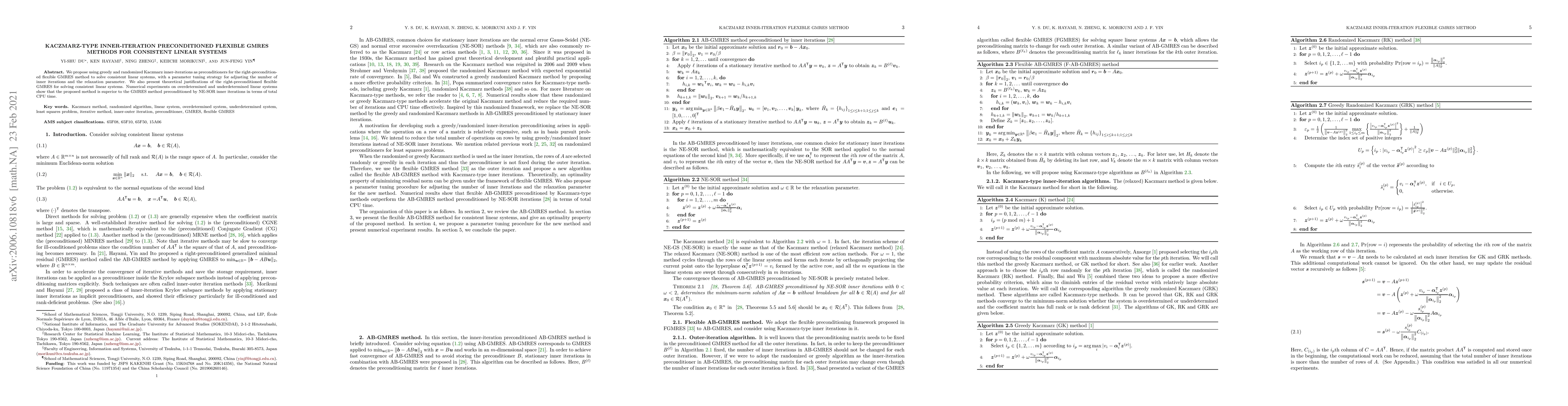 This paper proposes using Kaczmarz-type inner-iterations as preconditioners for the right-preconditioned flexible GMRES method to solve consistent linear systems, demonstrating superior performance over traditional methods in terms of CPU time. Theoretical justifications are provided, and numerical experiments confirm the effectiveness of the proposed approach.