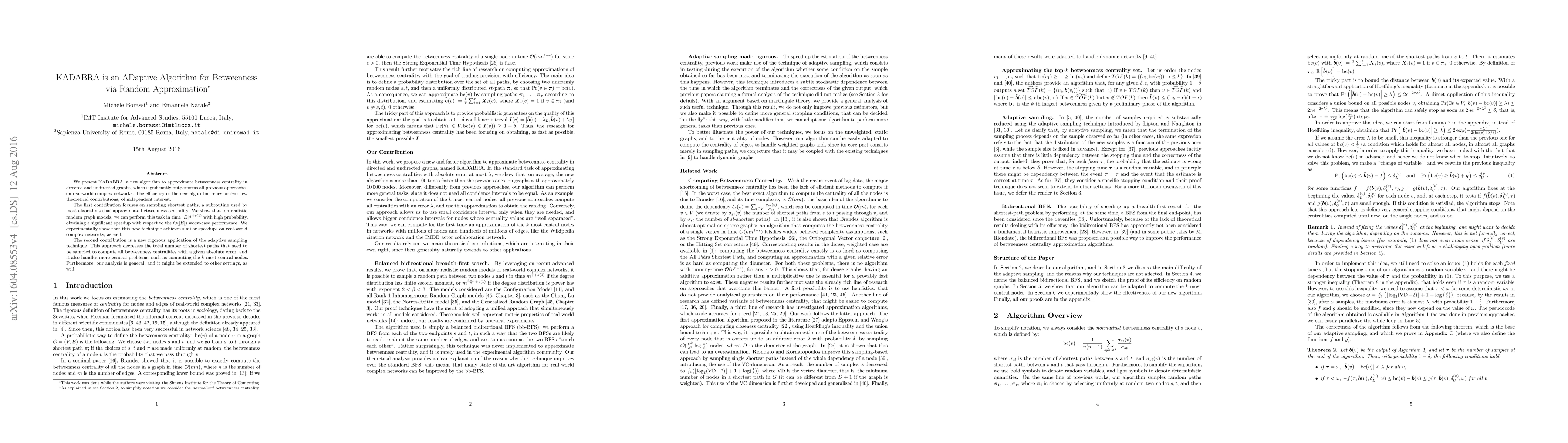 KADABRA is an efficient algorithm for approximating betweenness centrality in complex networks, achieving significant speedups over previous approaches. It achieves this through innovative sampling techniques and can be applied to compute multiple centrality measures with improved accuracy.