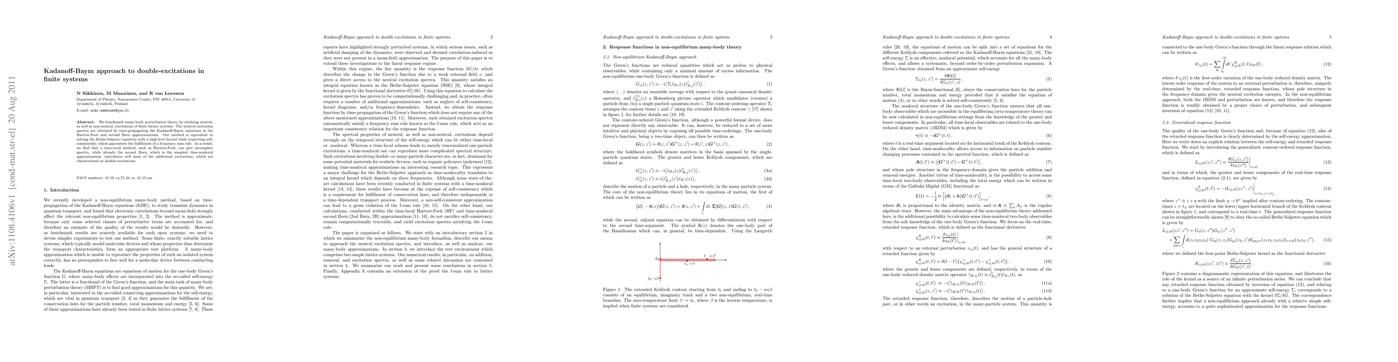 We benchmark many-body perturbation theory by studying neutral, as well as non-neutral, excitations of finite lattice systems. The neutral excitation spectra are obtained by time-propagating the Kadanoff-Baym equations in the Hartree-Fock and second Born approximations. Our method is equivalent to solving the Bethe-Salpeter equation with a high-level kernel while respecting self-consistently, which guarantees the fulfillment of a frequency sum rule. As a result, we find that a time-local method, such as Hartree-Fock, can give incomplete spectra, while already the second Born, which is the simplest time-nonlocal approximation, reproduces well most of the additional excitations, which are characterized as double-excitations.