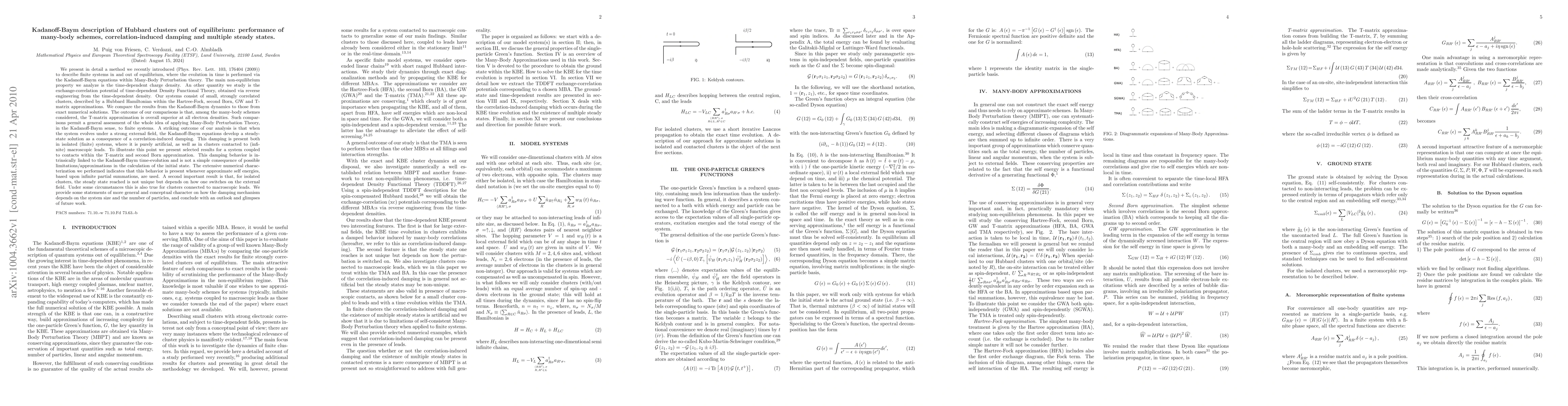We present in detail a method we recently introduced (PRL. 103, 176404 (2009)) to describe finite systems in and out of equilibrium, where the evolution in time is performed via the Kadanoff-Baym Equations (KBE) within Many-Body Perturbation Theory (MBPT). The main property we analyze is the time-dependent density. We also study is the exchange-correlation potential of TDDFT, obtained via reverse engineering from the time-dependent density. Our systems consist of small, strongly correlated clusters, described by a Hubbard Hamiltonian within the Hartree-Fock, second Born, GW and T-matrix approximations. We compare the results from the KBE dynamics to those from exact numerical solutions. The outcome of our comparisons is that, among the many-body schemes considered, the T-matrix approximation is overall superior at all electron densities. Such comparisons permit a general assessment of the whole idea of applying MBPT, in the KBE sense, to finite systems. A striking outcome of our analysis is that when the system evolves under a strong external field, the KBE develop a steady-state solution as a consequence of a correlation-induced damping. This damping is present both in isolated (finite) systems, where it is purely artificial, as well as in clusters contacted to (infinite) macroscopic leads. To illustrate this point we present selected results for a system coupled to contacts within the T-matrix and second Born approximation. The extensive characterization we performed indicates that this behavior is present whenever approximate self energies, based upon infinite partial summations, are used. A second important result is that, for isolated clusters, the steady state reached is not unique but depends on how one switches on the external field. This may also true for clusters connected to leads.