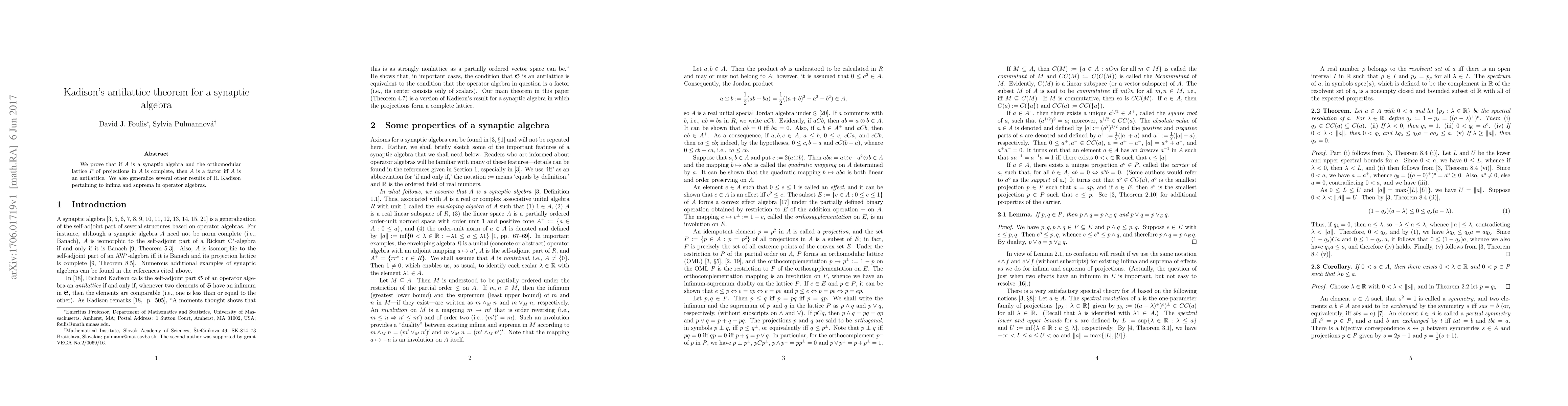 We prove that if A is a synaptic algebra and the orthomodular lattice P of projections in A is complete, then A is a factor iff A is an antilattice. We also generalize several other results of R. Kadison pertaining to infima and suprema in operator algebras.