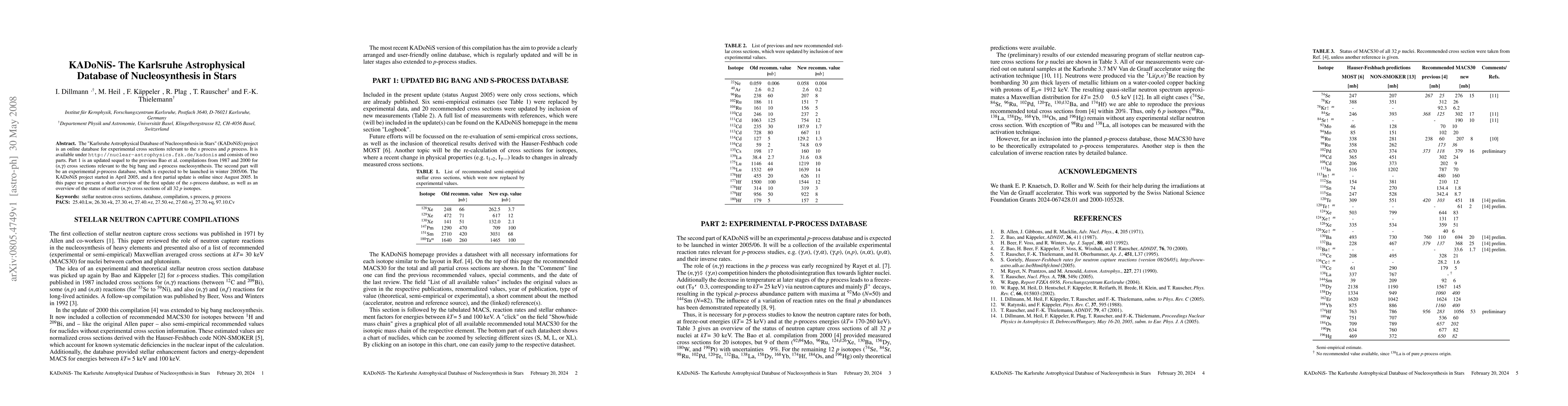 KADoNiS is an online database for experimental cross sections relevant to nucleosynthesis processes in stars, featuring an updated s-process database and an upcoming p-process database. The first partial update of the s-process database is available, along with a status overview for stellar (n,γ) cross sections of 32 p isotopes.